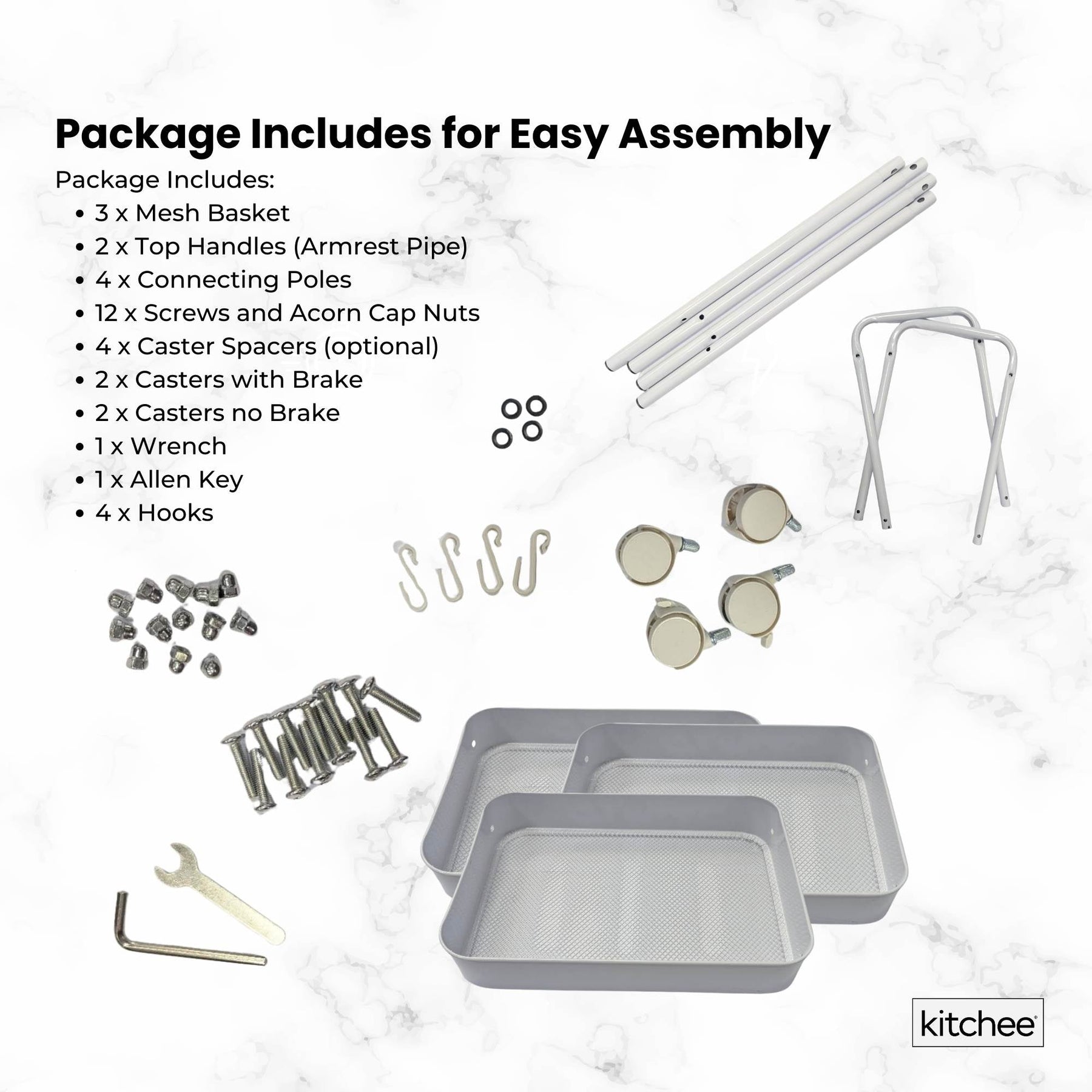 Kitchee 3-Tier Kitchen Storage Cart with Lockable Wheels will keep your home or office organised with this versatile rolling storage trolley. Featuring durable metal mesh moulded shelves, smooth-rolling caster wheels, and a lightweight steel frame, it’s ideal for use in the kitchen, bathroom, bedroom, office, or anywhere you need extra storage.