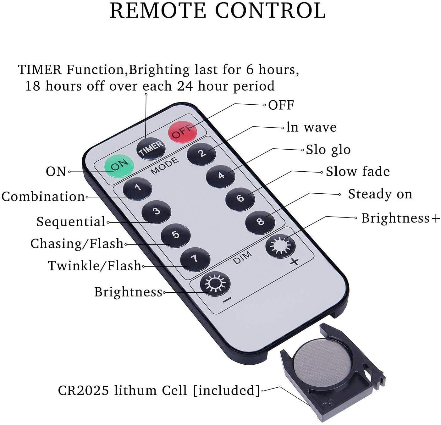 - 8 Modes settings with Remote Control:13-key buttons: TIME Mode (6hours on and 18 hours off automatically cycle) 8 Modes: combination, in waves, sequential, slogs , chasing/flash, slow fade, twinkle/flash, and steady on Press DIM- or press DIM+ of remote control to adjust the brightness of the lights on and off.
