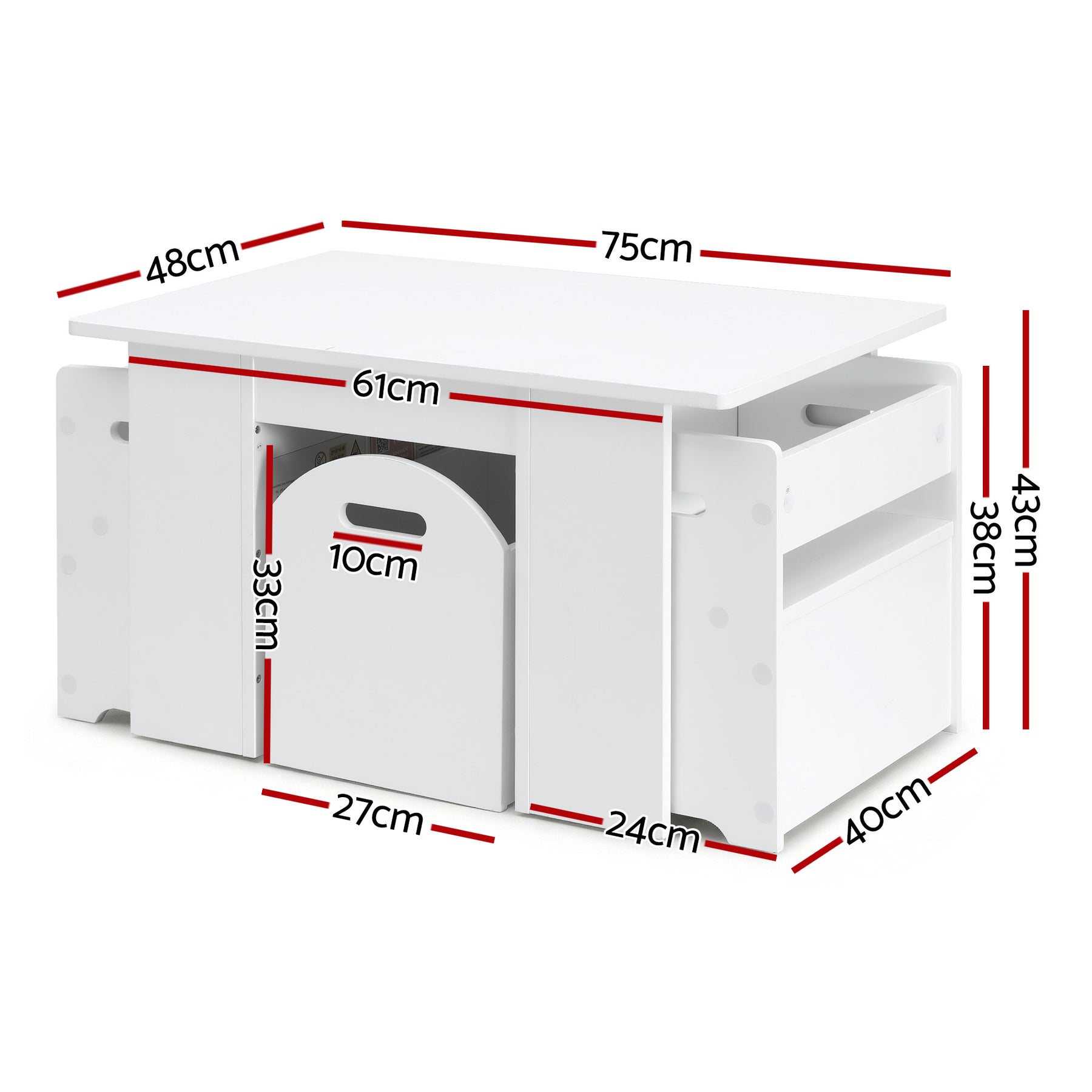 The chairs, when pushed right in, sit flushed under the table. Within the centre support, a large storage box with ample space for toys and stuff, can be easily pulled in and out for hidden storage. Further consideration is also given to handling the chairs and box with convenient hand grips on them.