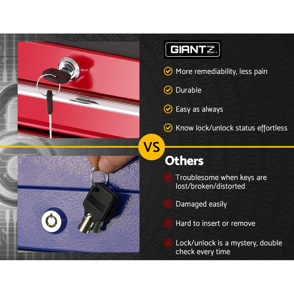 This robust, multi-drawer Giantz Tool Trolley is an essential for any workshop. Crafted from durable steel, it features smooth ball-bearing slides for easy access and a secure lock system for safety. Its spacious design includes varying drawer sizes to accommodate tools of all shapes, complete with non-slip liners. The chest is also mounted on omni-directional castors with locakble front wheels, ensuring a smooth maneuverability and stable positioning. Sleek and functional, it's perfect for organizing and protecting your valuable tools.