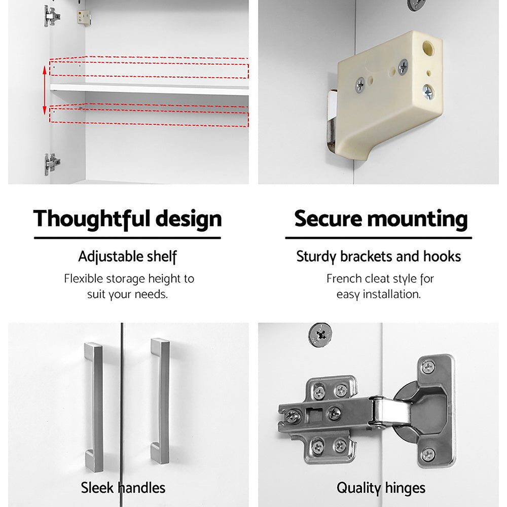 Tired of a messy home? Running out of storage space? Thankfully, you can start to declutter and organise your home beautifully with our sleek Cefito Wall Cabinet. Featuring an E1 engineered wood construction that is eco-friendly and non-irritating, our wall cabinet is a two-shelf cupboard with adjustable middle shelf to accommodate contents of various sizes. You will find quality hinges and sleek sturdy handles for hassle-free opening and closing, and smooth round edges for safe use. More importantly, the cabinet has a French cleat style mounting system with sturdy brackets and hooks for easy installation. Not least, its contemporary design will match easily with any modern décor as will its compact sizing. In fact, the wall cabinet is perfect for creating extra overhead space wherever it is needed: in your kitchen, bathroom, living room, bedroom, balcony, office and more. So start organising your home and your lifestyle with our simple and extremely functional wall cabinet.