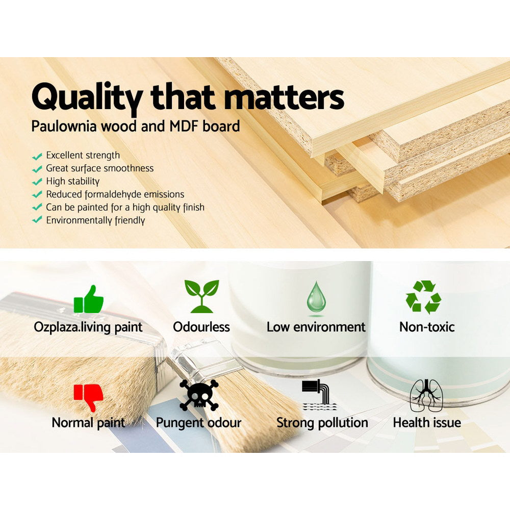 With its vintage chic, our Artiss Thyme Bedside Table is as stylish as it is practical. The 18mm thickness Paulownia wood and MDF construction ensure that the furniture piece is able to withstand daily robust use. The drawer is deep and runs smoothly while the bottom shelf adds an extra display shelf. Use it in any space or in any room where a convenient and compact drawer will do wonders to your storage needs. Finished in an eco-friendly non-toxic paint, the ensemble also includes an antique-inspired handle and anti-scratch feet pads.
