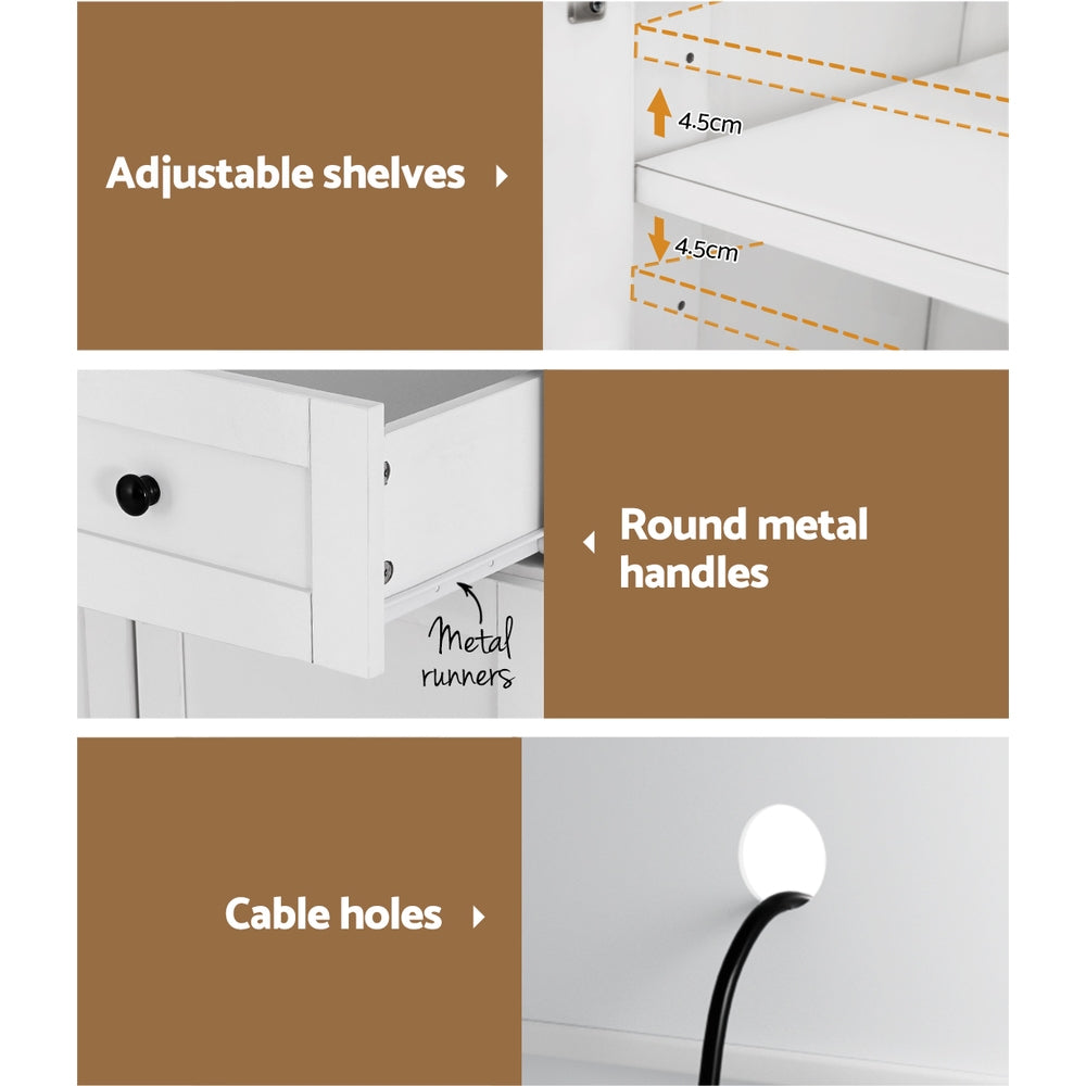 For elegant and practical storage solutions, look no further than the Beini Buffet Sideboard. At 180cm high, the cabinet has ample storage and a wide countertop, offering both functionality and elegance. The quality wooden frame ensures durability, while the four doors with quality hinges provide easy access to your belongings. Inside, you'll find two adjustable shelves and one spacious drawer, perfect for organizing your items. The sleek round metal handles add a touch of sophistication, while the smooth metal runners make using the drawers effortless. With the included cable management hole, you can keep your electrical cords clean and organised. Safety is our priority, which is why we've included an anti-tip kit for added stability and peace of mind. Cleaning and maintenance are easy thanks to the smooth surface. With its easy assembly, you can enjoy your new buffet sideboard in no time. Upgrade your home storage with the Beini Buffet Sideboard today.