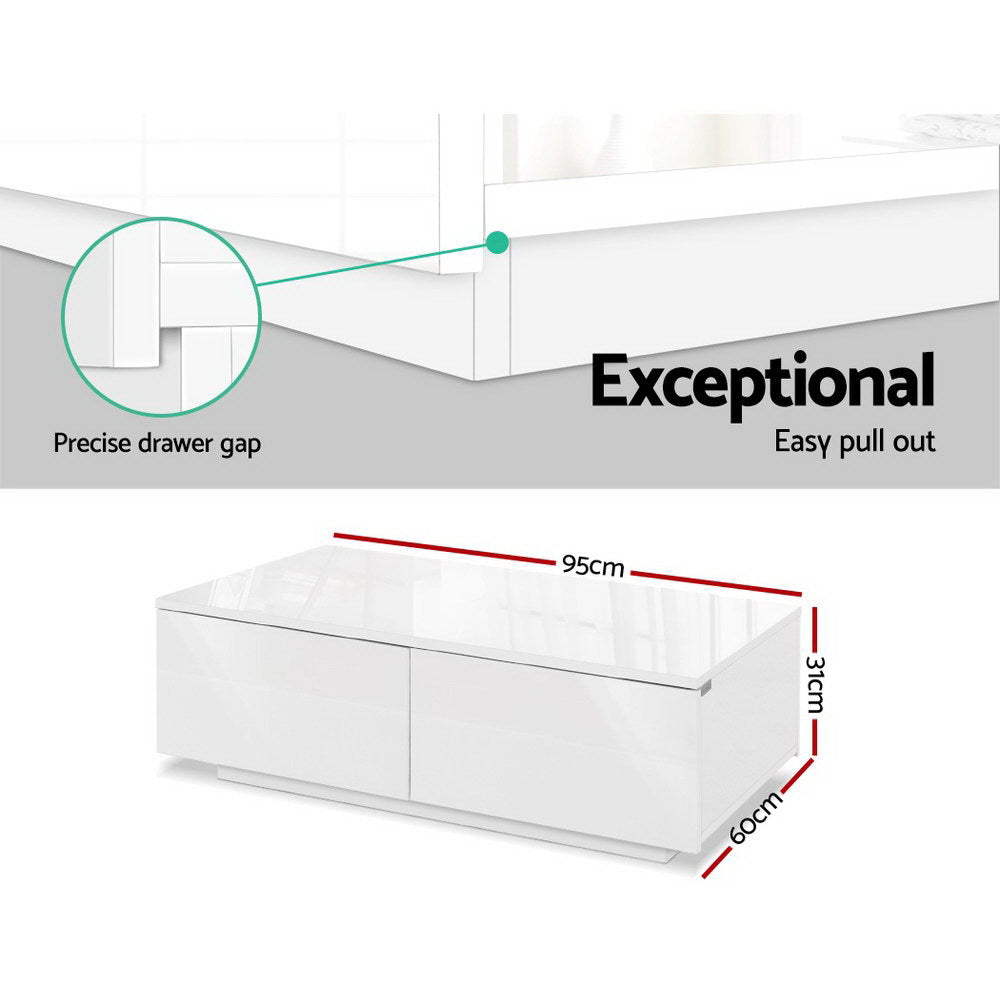 Keep all your books, magazines, remote controls and other entertainment paraphernalia from cluttering up your living room with our Artiss Coffee Table. Four drawers, with two on each side, provide flexibility and ample storage space for all your necessities. The longer drawer boards and anti-rust runners also allow for a smooth and hassle-free operation at all times. The table is not only practical but also stylish with a handle-less design to maintain a sleek appearance. The contemporary and linear design means that the table will be the perfect addition to your modern living room. Or any other room, for that matter. Made of quality particle board, the table is built to last. And the UV high-gloss finish not only makes the table attractive, but also easy to clean.