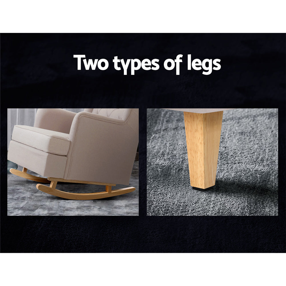 Be swayed. Rock on and relax with our Artiss Gaia Rocking Chair. It comes with two sets of removable legs so that you can use it as a rocking chair or a stationary chair. The gentle swaying of the rocking chair would be perfect for reading, listening to music, taking a much-needed nap, or even rocking your baby to sleep. Or simply swap the legs over and you have a classic accent chair. The iconic design and the tufted wingback exude elegance and timeless appeal. This makes the chair suitable for any décor, from your living room to your nursery. The extra thick foam padding and wide back ensure ultimate comfort with exceptional support. The armchair feet are fitted with pads to keep your floors pristine from scratches and damage. Together with a reinforced wooden frame and quality faux linen fabric upholstery, our armchair is guaranteed to stand up to durable use for many years to come.