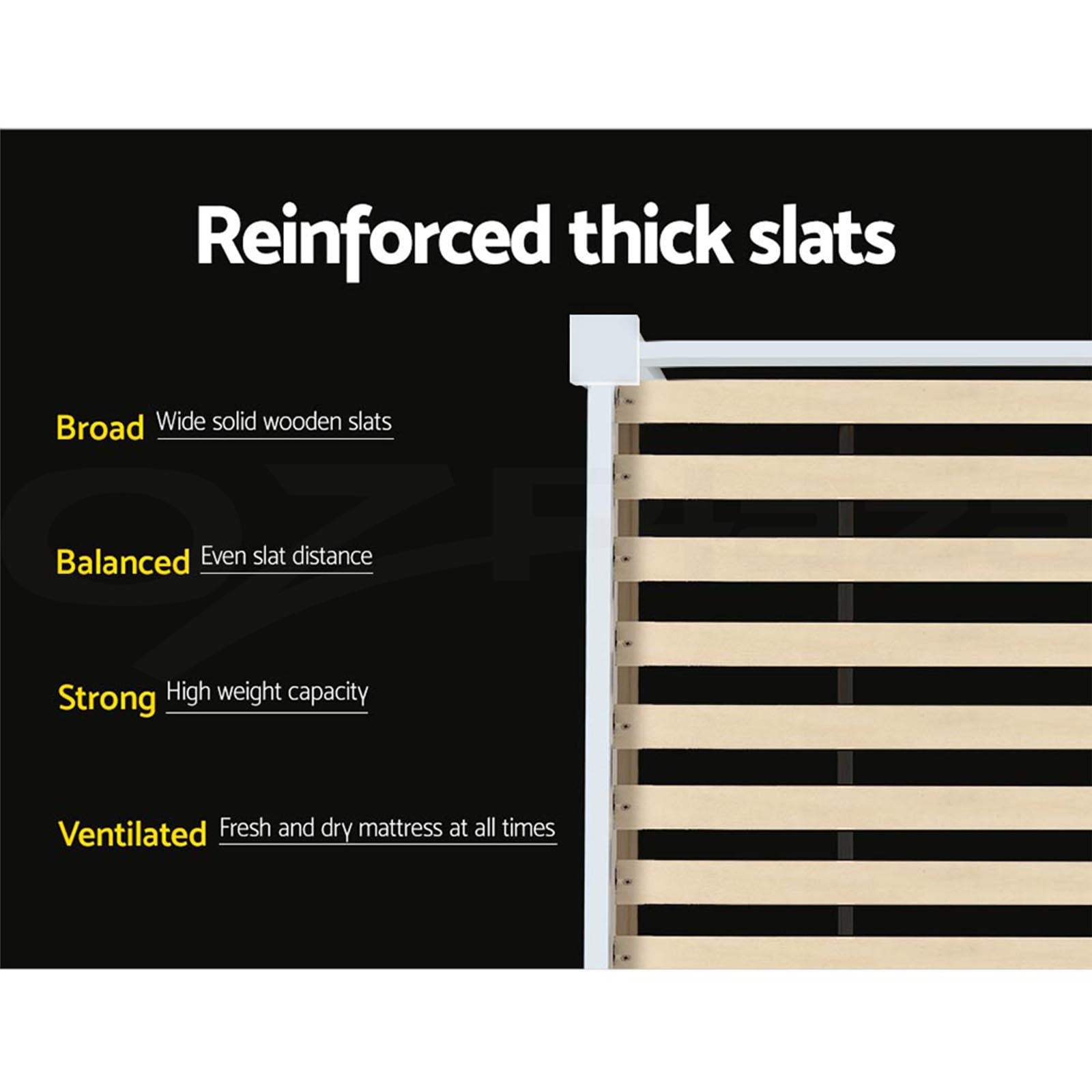 Made of natural pine wood, the Rio bed frame is ideal for your kids as it for any adult. Strong and sturdy, the bed frame comes with a solid timber slated base, stylish headboard, heavy duty steel fixings and smooth edges all round. Finished in a non-toxic, white paint, the neutral coloured bed frame makes for easy decoration coordination with any bedroom. The bed frame becomes an instant storage area with acres of space for your bedding essentials. Go extra neat and tidy. So create more and expand your home storage capacity with the Artiss Rio Bed Frame. Get yours today.