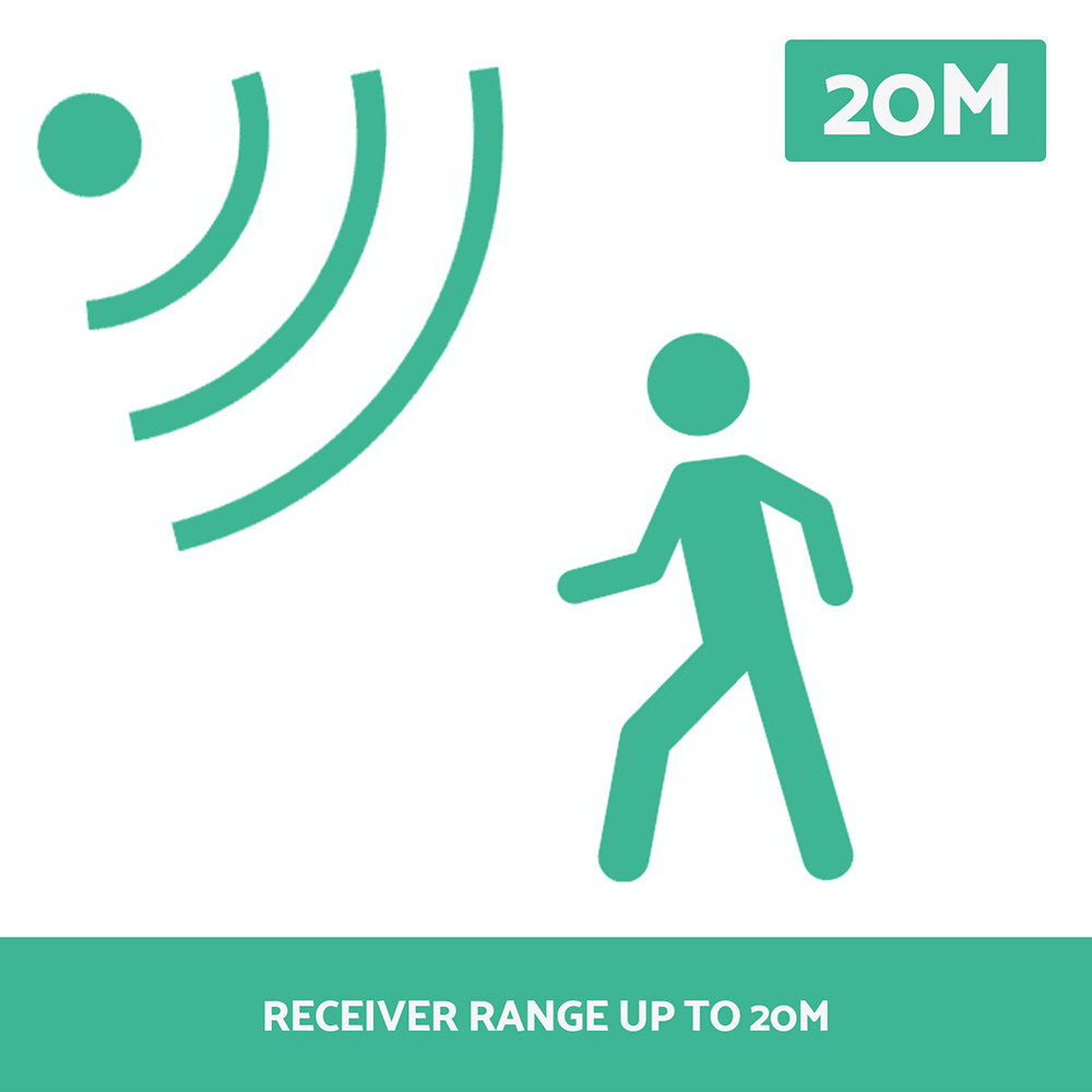Receiver range: ≤20m. Range can be reduced to 30% in bad weather conditions.