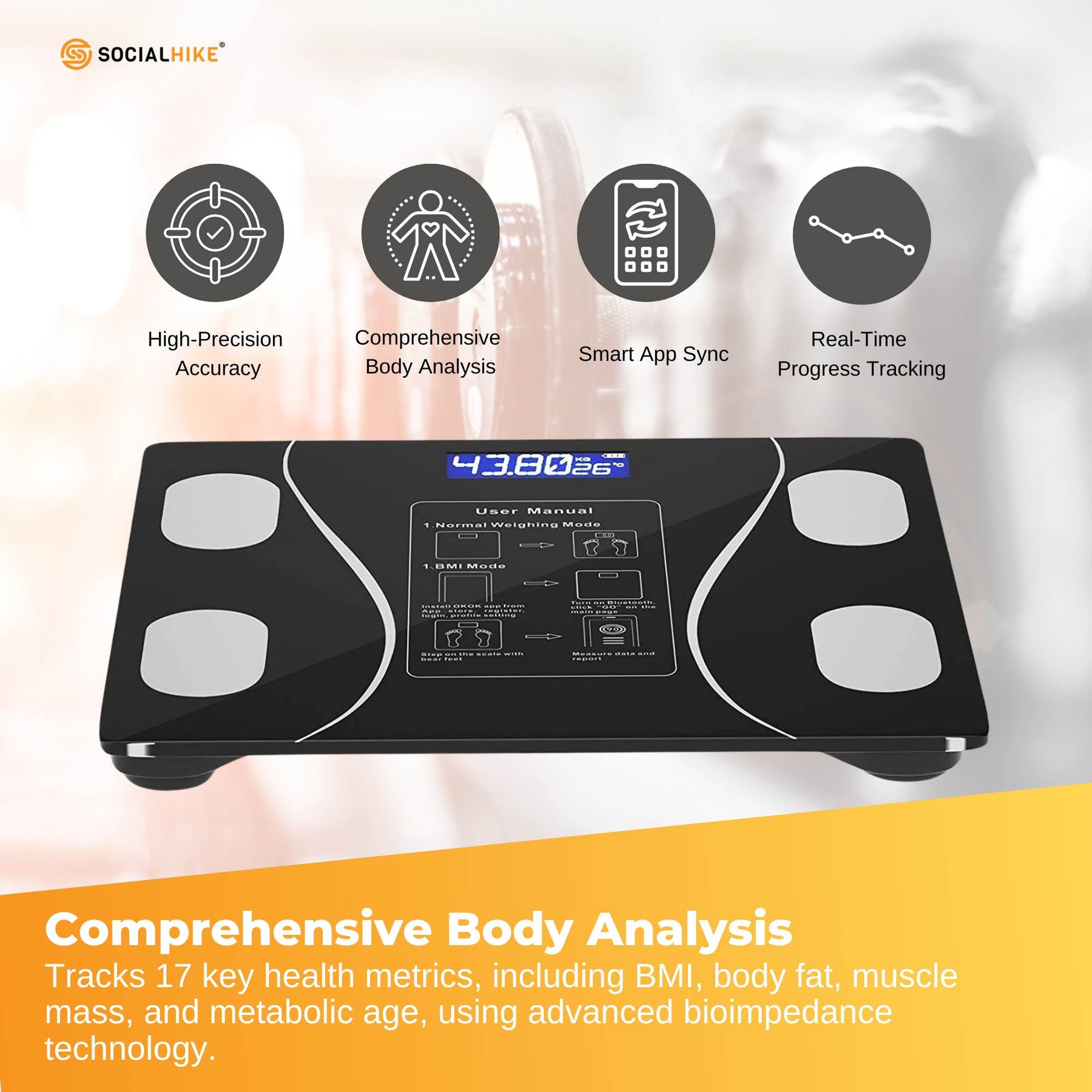- Comprehensive Body Analysis – Tracks 17 essential health metrics like BMI, body fat, muscle mass, water percentage, and metabolic age using advanced bioimpedance technology.