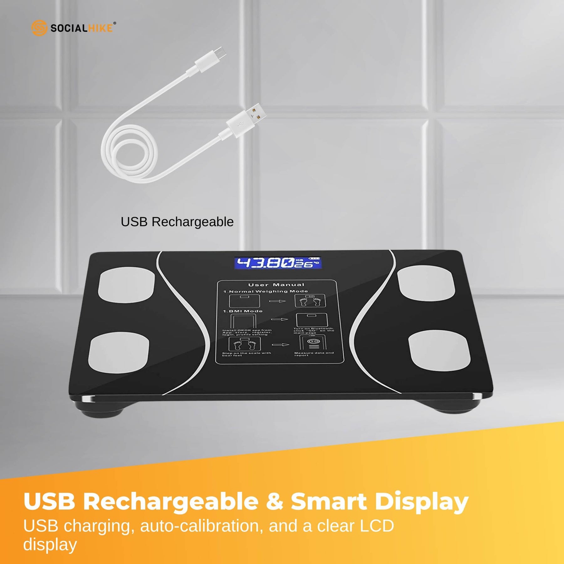 USB Rechargeable Smart Display – No batteries needed! Enjoy USB charging, auto-calibration, and a clear LCD display with low battery overload indicators for hassle-free use.