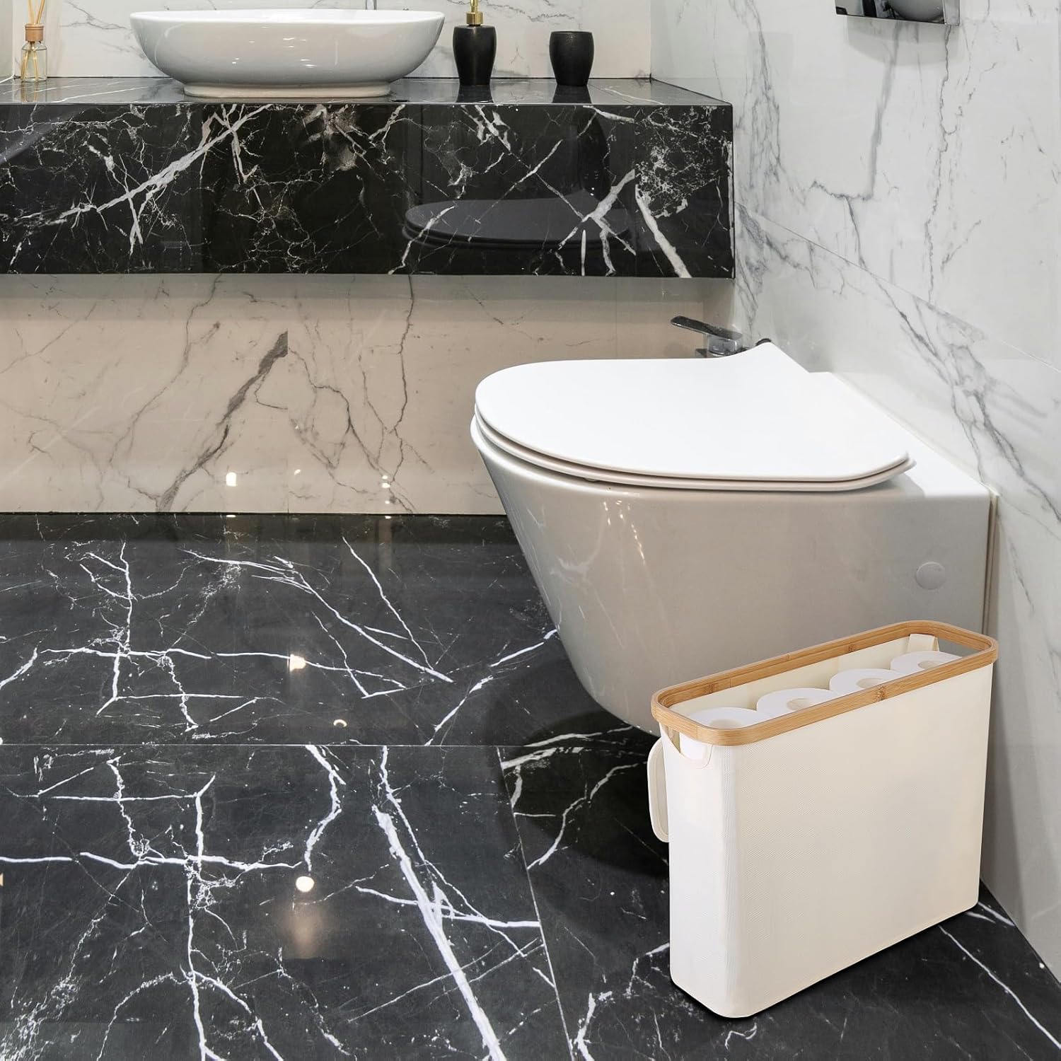 CARLA HOME Toilet Paper Storage Basket Holds Up to 12 Rolls with Bamboo Lid and Handle for RV Closet (White)