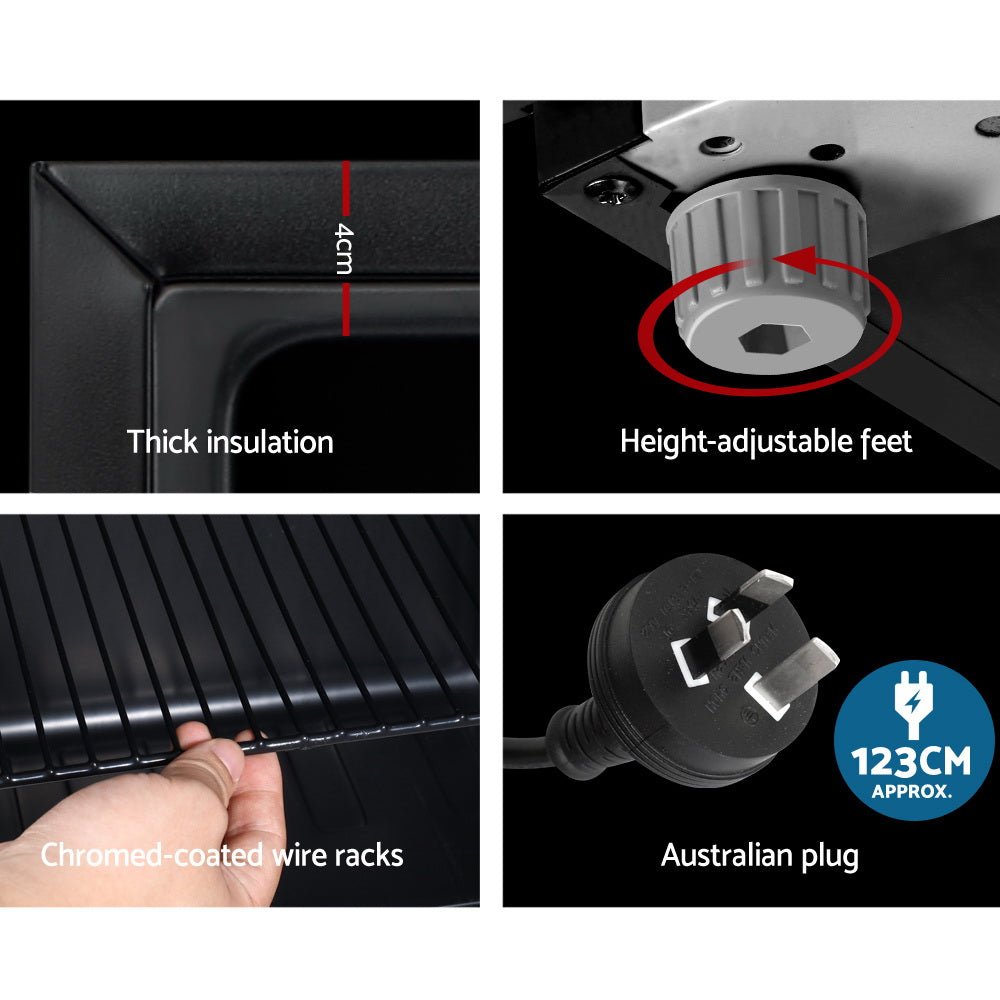 Our portable Devanti Bar Fridge is great for keeping a variety of food and beverages chilled and cooled without taking up too much space. Designed with seven temperature settings, the energy-efficient bar fridge lets you set your desired coolness and freshness. Other great features include adjustable shelves, double-glazed door, height-adjustable feet, built-in handle and consistent refrigeration to name a few. The compact bar fridge is also totally eco-friendly with its R600a freon-free refrigerant and well-made for robust use, such as the extra thick insulation and a built-in LED lamp to ensure operation is smooth, quiet and hassle-free. The fridge also comes with a built-in lock to keep the contents safe and secure, especially useful in a retail environment after you close for the night. Suitable for both domestic and commercial use, the Devanti bar fridge is a cool investment time and again.