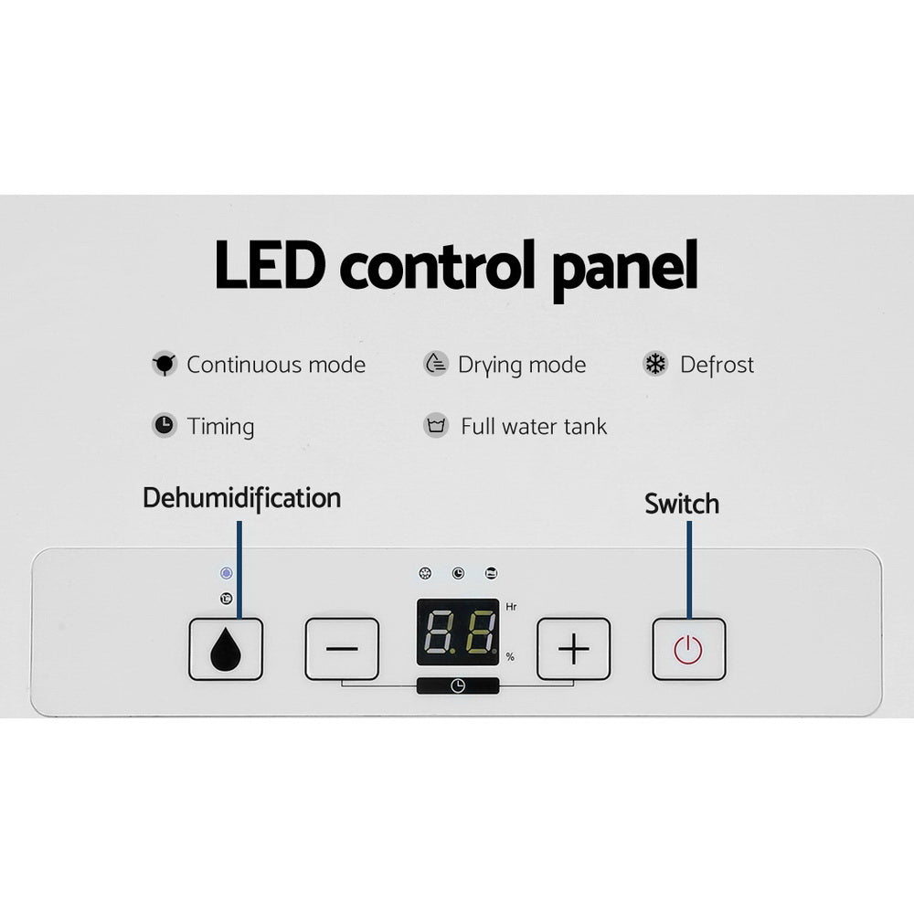 Do you feel trapped and stuffy at home? Do you have trouble with mould and mildew? The problem may be your air quality. Let our Devanti Dehumidifier rid you of strong odours, dust and high humidity in your home. The 2-in-1 device acts as both a dehumidifier and an air purifier to eliminate VOCs and other unwanted particles in the air. A washable air filter allows you to effectively filter every time without having to change parts. With its efficient compressor, you can eliminate 12L of water per day without overspending on electricity. With a 24-hour timer, you can set and forget as your device automatically cleans your air quietly and efficiently. The handy LED screen will always keep you informed. Drain the recaptured water into the 2.1L water tank or drain it where it needs to go with the included 30cm water pipe. Finally, the entire device is set on smooth castor wheels and features a convenient handle for portability. Stop suffering and start breathing easy again with a Devanti Dehumidifier.