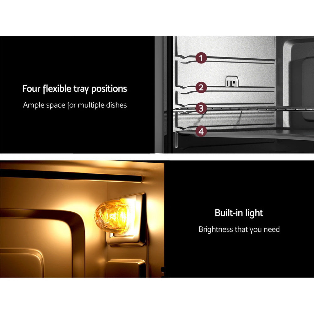 Need a multi-functional oven that you can take anywhere? Or do you need a solution for a home without an existing oven? Look no further than the Devanti Convection Oven. Portable and easy to use, the 45L capacity oven can bake, grill and roast to create your favourite recipes with minimum hassle. The oven is well insulated and has a cool-touch handle to always keep heat and radiation at bay for comfortable cooking. It features a rotisserie option for even cooking, 4 flexible tray positions and your choice of heating element options for precise cooking control every time. With its tempered glass door and built-in light, you can always monitor the progress of your cooking and adjust the temperature as needed. It also has a 60-minute timer with an alarm to help you time your cooking to perfection. Not least, the oven also comes with a host of bonus accessories that include a baking tray, wire rack, tray handle, rotisserie fork and rack, so you'll have everything you need to start cooking pronto!