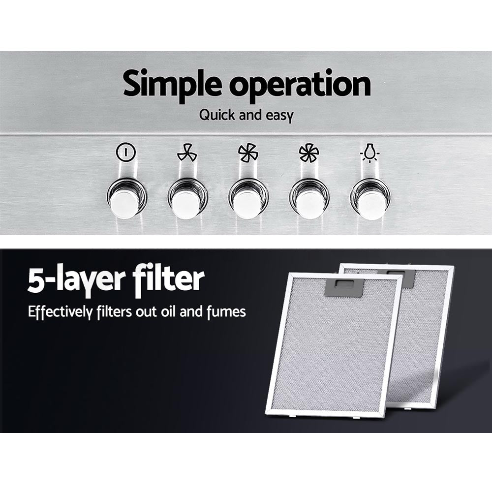 Say goodbye to smoky fumes and unwelcome cooking odours with the Devanti Range Hood. With its high-performance motors, the brushed stainless steel range hood provides a steady upflow and filtered extraction of fumes and oil to keep your cooktop area clean and fresh after every use. With its 3-speed rocker button switches, the extraction speed can be adjusted to suit the circumstances. Other features include two non-stick 5-layer aluminium filters that are removable and replaceable and bright LED lighting to facilitate your illuminated cooking. The range hood is wall mounted and the chimney can be adjusted to fit the installation space.