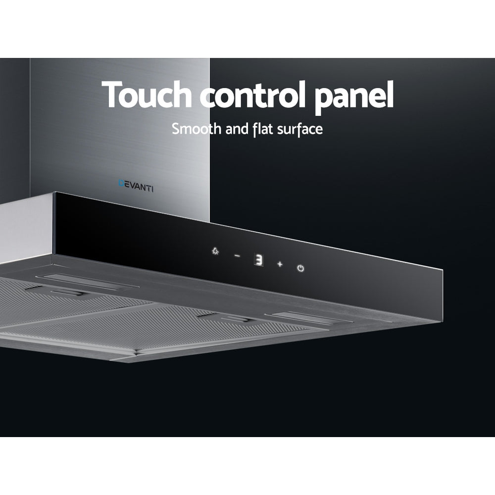 Say goodbye to smoky fumes and unwelcome cooking odours with our Devanti Range Hood featuring an elegant black tempered glass body that looks as good as it functions. With its high-performance motors, the range hood provides a steady upflow and filtered extraction of fumes and oil to keep your cooktop area clean and fresh after every use. With its 3-speed touch controls, the extraction speed can be adjusted to suit the circumstances. Other features include non-stick 5-layer aluminium filters that are removable and replaceable and two bright LED lamps to facilitate your illuminated cooking. The range hood is wall mounted and the chimney can be adjusted to fit the installation space.