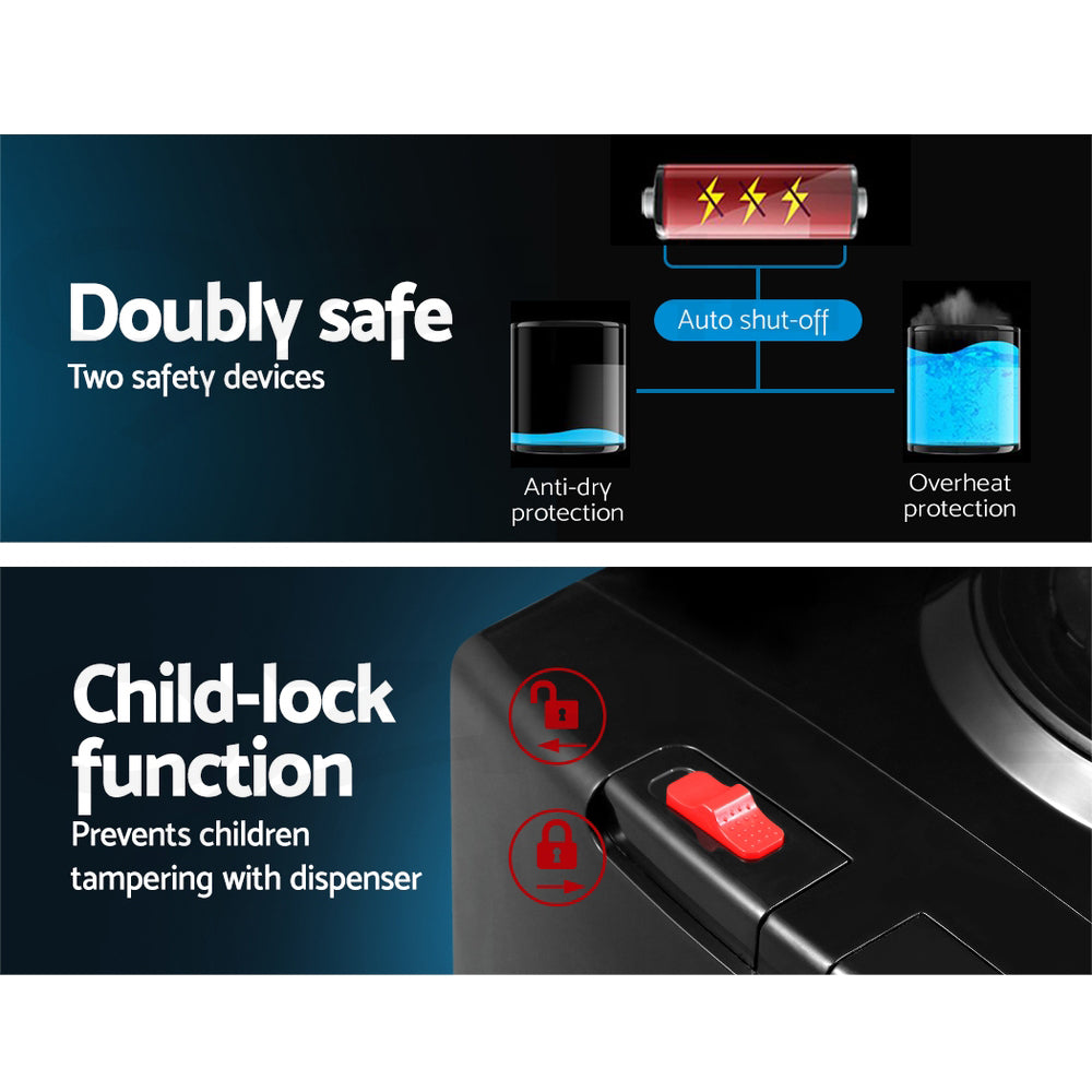 Have access to cleaner and purer water at all times with our Devanti Water Cooler Set. With a refillable container capacity of 22 litres, the cooler is large enough to provide purified water on demand hassle-free, thanks to its 7-stage filtration system that ensures your water tastes great and is free of harmful chemicals and impurities. The water cooler is designed to work with most bottled water or water filter containers and features an electronic refrigeration system that works quietly and reliably. It comes with a detachable water guide plate for use with bottled water. The cooler has LED indicators for easy operation and dual taps for hot and cold water options. The tray height can also be adjusted to suit your use and a removable drip tray allows for easy cleaning. For added safety, the cooler has overheating, over-current, anti-dry and electric-shock protection and a child-lock to prevent children from tampering with the unit. Not least, the cooler has a large storage cabinet to store any accessories or drinking essentials.