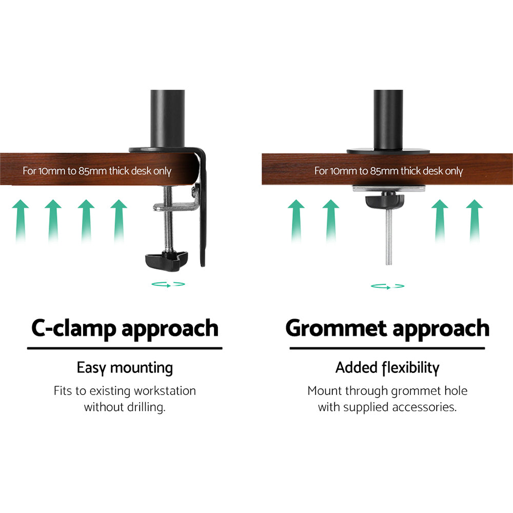 Add some extended mobility to your monitor with our Artiss Fully Adjustable Dual Monitor Arm. With it, you can extend both arms up to 43cm to set your preferred viewing position and retract it with ease. Height adjustments can be easily done by twisting the height adjustment screw. It also allows you to swivel your monitor 180°, rotate it 360° or tilt it up to 45° and set in either landscape or portrait format. Using the detachable VESA mount, you can mount any monitor size of up to 32"* with a maximum weight capacity of 9kg on each arm. Plus, you can also fine tune the monitors' alignment with the VESA plate height adjustment. Other great features include alternative set ups, cable loops for neat and tidy cabling and a tools holder for allen keys. Not least, made from heavy-duty steel, the monitor arms are designed to stand up to longlasting use without missing a beat. All the necessary mounting hardware and an assembly manual are included in the package for a hassle-free set up.
