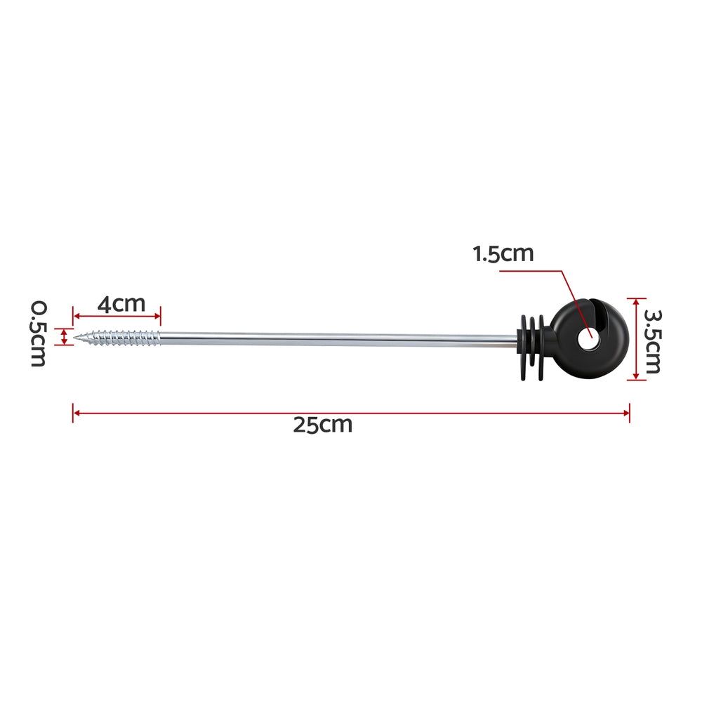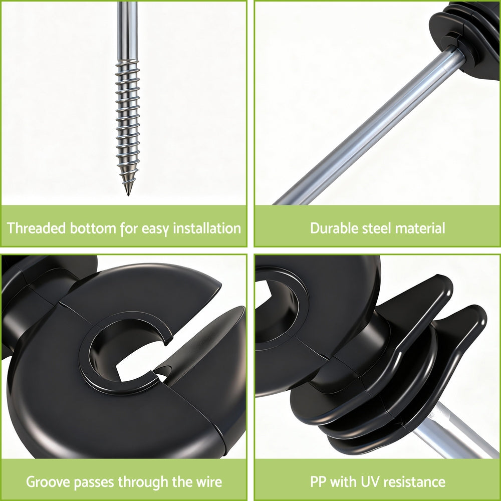 This Giantz electric fence kit includes 100pcs electric fence insulators, essential for any electric fencing setup. These electric fence pinlock insulators provide good insulation for secure attachment. Made from high-strength, UV-resistant PP, they are built to withstand Australian conditions. They are versatile and suitable for wire, polywire, rope, and electric fence tape, functioning effectively as start, end, corner, or line insulators.