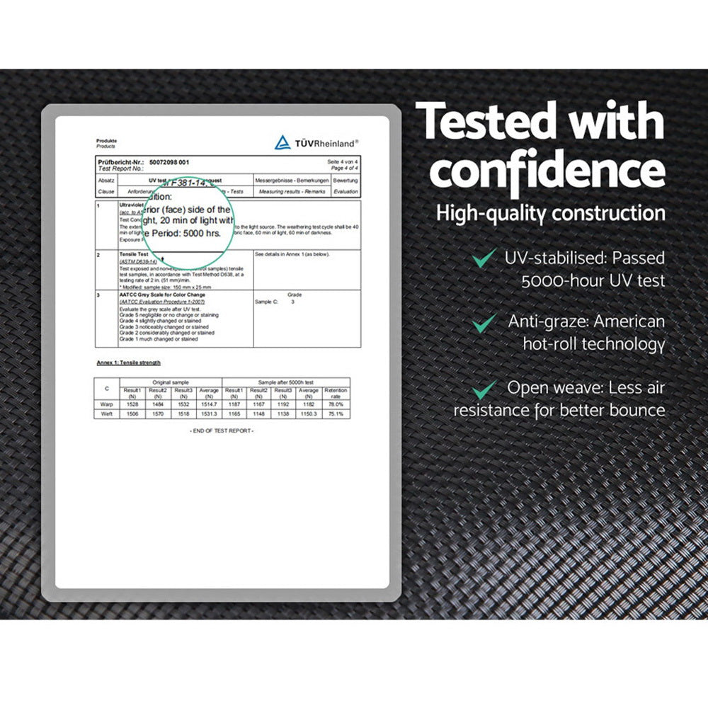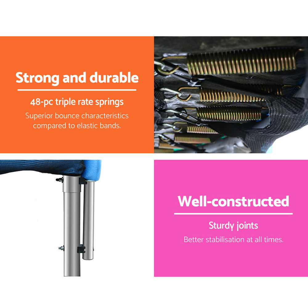 Bounce to your heart's content with our Trampoline. With its superior bounce characteristics featuring 64-piece triple rate springs, the 10-foot trampoline enables safe and durable bouncing with no worries. The heavy-gauge steel framework is designed to handle all robust play and is UV-tested for quality and reliability. Other great features include 8 posts for strong support, 20mm thick padding, anti-graze mat, safety netting and a double-lock zip-and-clip entry. So jump to it and order our trampoline today.