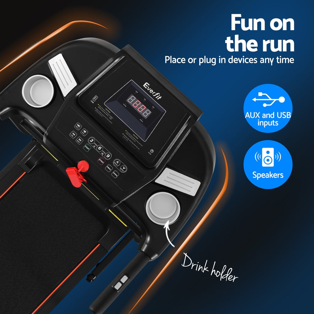 For a truly effective approach to weight loss and toning, our Everfit Electric Treadmill is your perfect companion. Compact and sturdy with its powder-coated steel frame, the treadmill allows you to perform essential cardio exercises within the comfort of your home. It features 12 pre-set training programs designed to simulate natural terrain. A user-centric control panel with a digital LCD display lets you set up to speeds between 1km/h and 12km/h and other monitoring parameters. Its powerful motor produces smooth and seamless operation and the anti-slip belt and soft-grip handlebar with pulse sensors make your session a comfortable and controlled experience. Other great features include a 3-level manual inclination adjustment, safety tether key, hydraulic fold-down for easy folding and storage, and smooth wheels for easy mobility. Not least, the treadmill is also equipped with MP3 connection, speaker output and dual drink holders to keep you both entertained and hydrated. For health results that matter, our Everfit Electric Treadmill is the one to run to.
