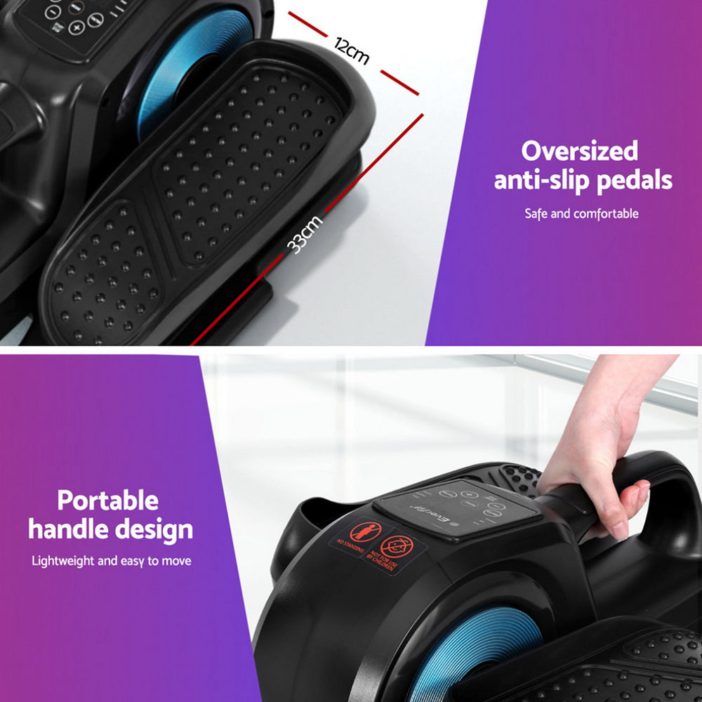 The Everfit Pedal Exerciser Machine is versatile fitness equipment that can be used to burn calories anywhere, whether sitting at a desk or watching TV. It offers both automatic and manual modes, with 12 speed level settings on manual exercise mode, all shown on the multi-function LCD monitor. The ergonomically designed machine is designed to have no impact on the knees and comes with a remote control, a low-noise yet powerful motor, a sturdy frame and non-slip feet. Its streamlined design requires no assembly, and it features a portable handle for easy moving. However, it is not intended for standing, nor for children's use, so caution is advised.