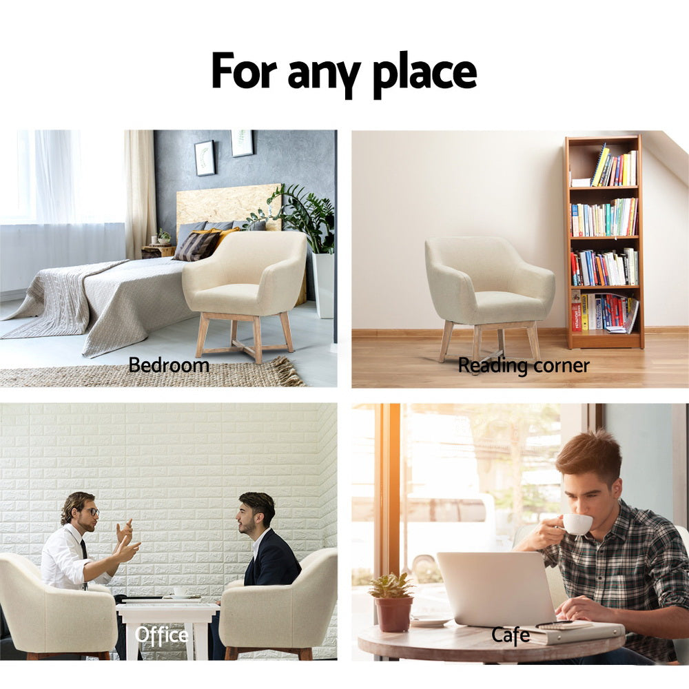 Modernise it armrests and thick seat padding that allows you to sink into for hours, it is that comfortable. Specially made of solid rubber wood with criss-cross base, offers a sturdy foundation in a minimalist shape. Match with classic beige fabric, it is versatile piece to fit in any room, lounge or study!