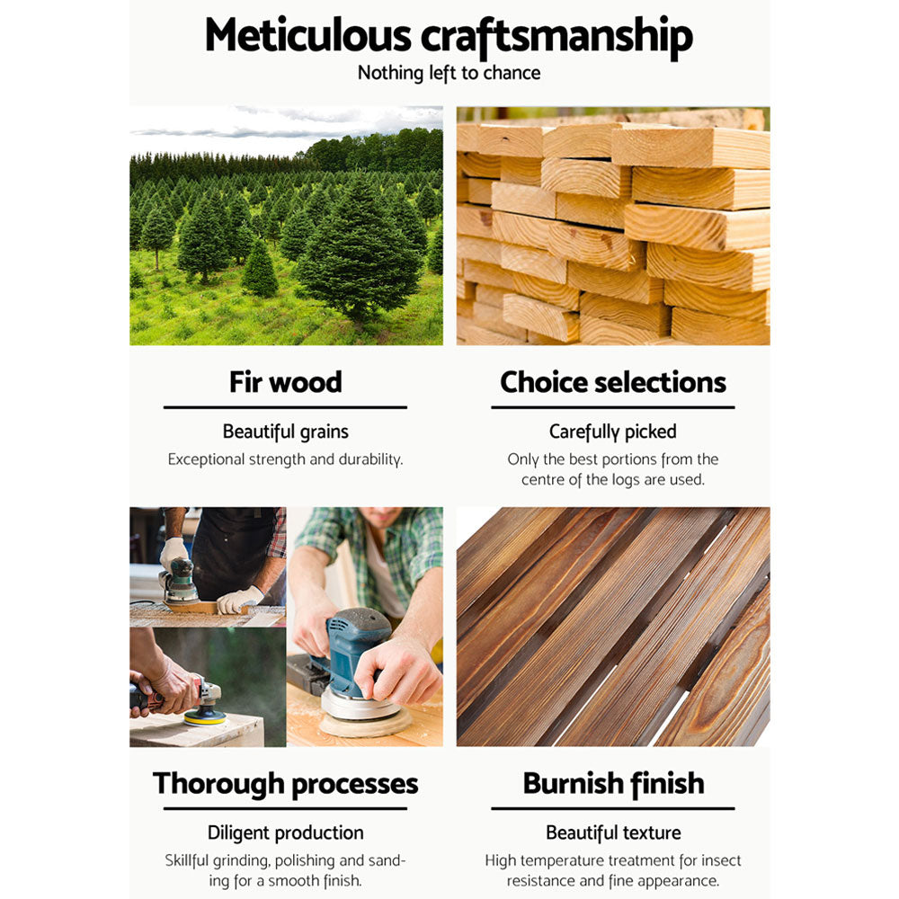 From its period styling to its rustic Fir wood design, the Wagon Wheels Bench is solidly built to seat two persons comfortably. The attention to details is excellent with finely crafted wagon-wheel armrests, a smooth and supportive backrest and exceptional strength and beautiful grains from the Fir wood finish. In fact, the Bench can take on a massive weight of up to 220kg. Better still, the Fir wood is weather-resistant, UV-resistant and blessed with a natural resistance to rot and pests. Everything you want in a durable and longlasting garden bench under the great Australian sun and rain.