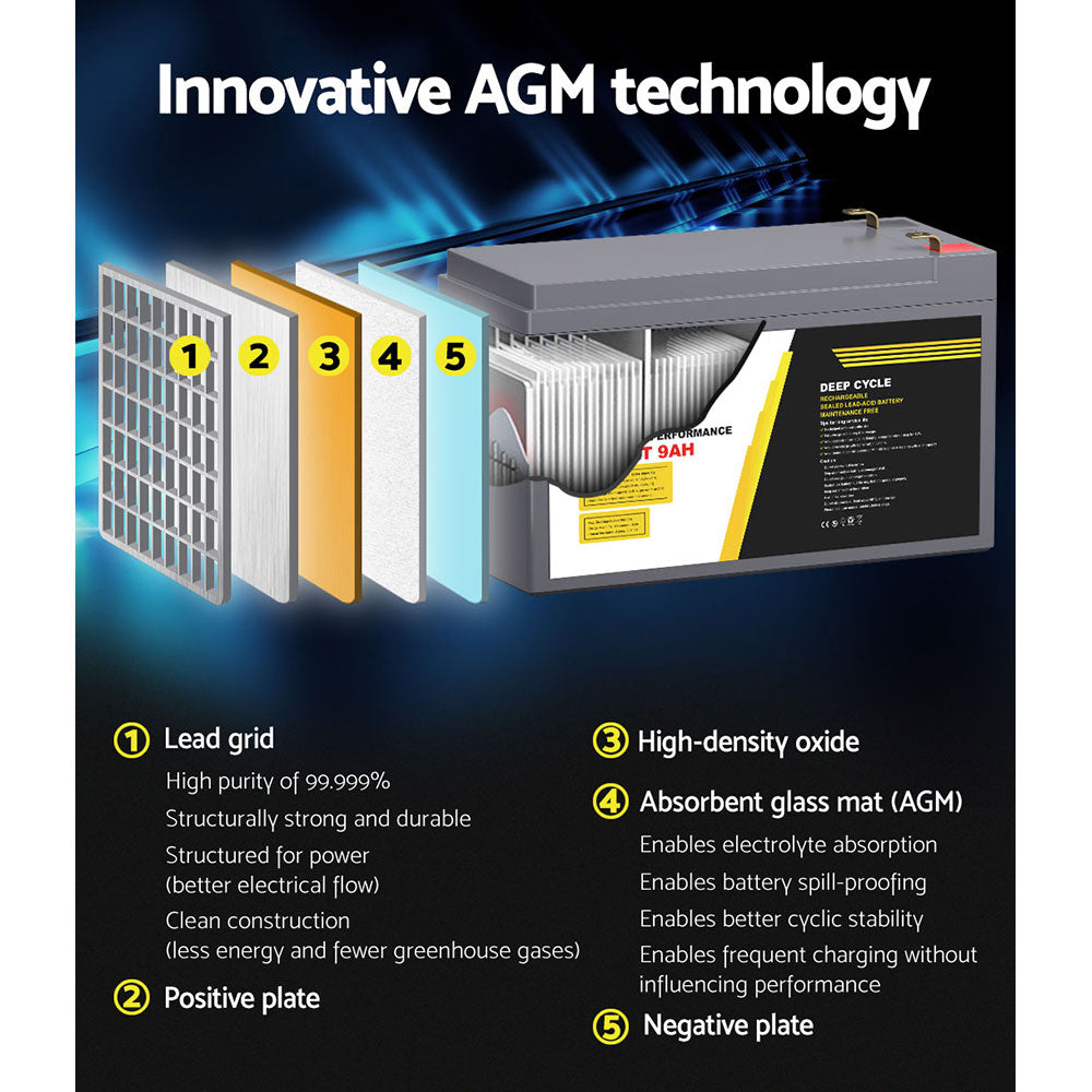 AGM Deep Cycle Battery 12V 9Ah Box Portable Solar Caravan Camping