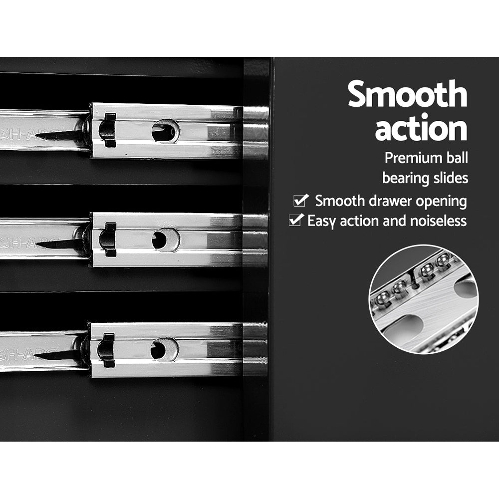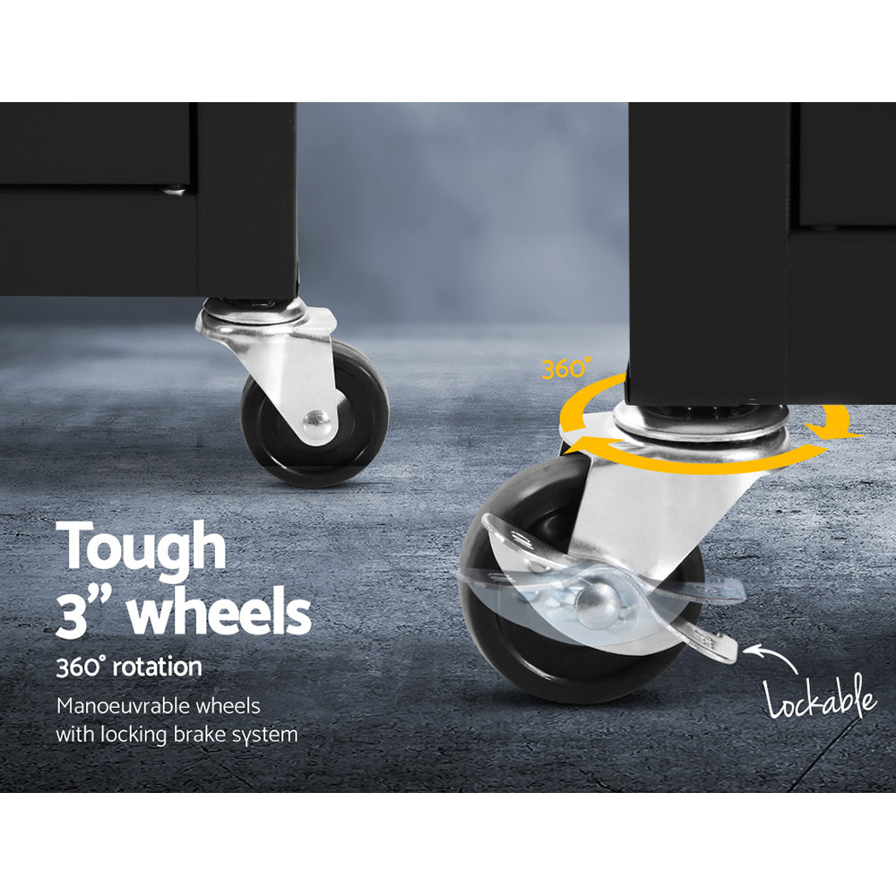This robust, multi-drawer Giantz Tool Trolley is an essential for any workshop. Crafted from durable steel, it features smooth ball-bearing slides for easy access and a secure lock system for safety. Its spacious design includes varying drawer sizes to accommodate tools of all shapes, complete with non-slip liners. The chest is also mounted on omni-directional castors with locakble front wheels, ensuring a smooth maneuverability and stable positioning. Sleek and functional, it's perfect for organizing and protecting your valuable tools.