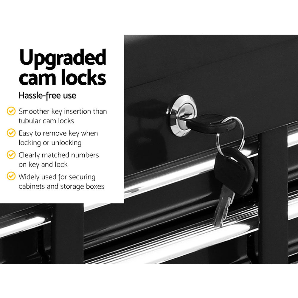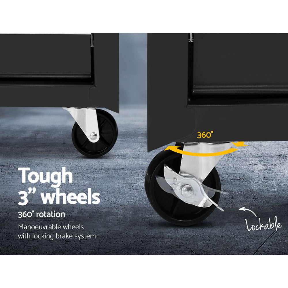 This robust, multi-drawer Giantz Tool Trolley is an essential for any workshop. Crafted from durable steel, it features smooth ball-bearing slides for easy access and a secure lock system for safety. Its spacious design includes varying drawer sizes to accommodate tools of all shapes, complete with non-slip liners. The chest is also mounted on omni-directional castors with locakble front wheels, ensuring a smooth maneuverability and stable positioning. Sleek and functional, it's perfect for organizing and protecting your valuable tools.