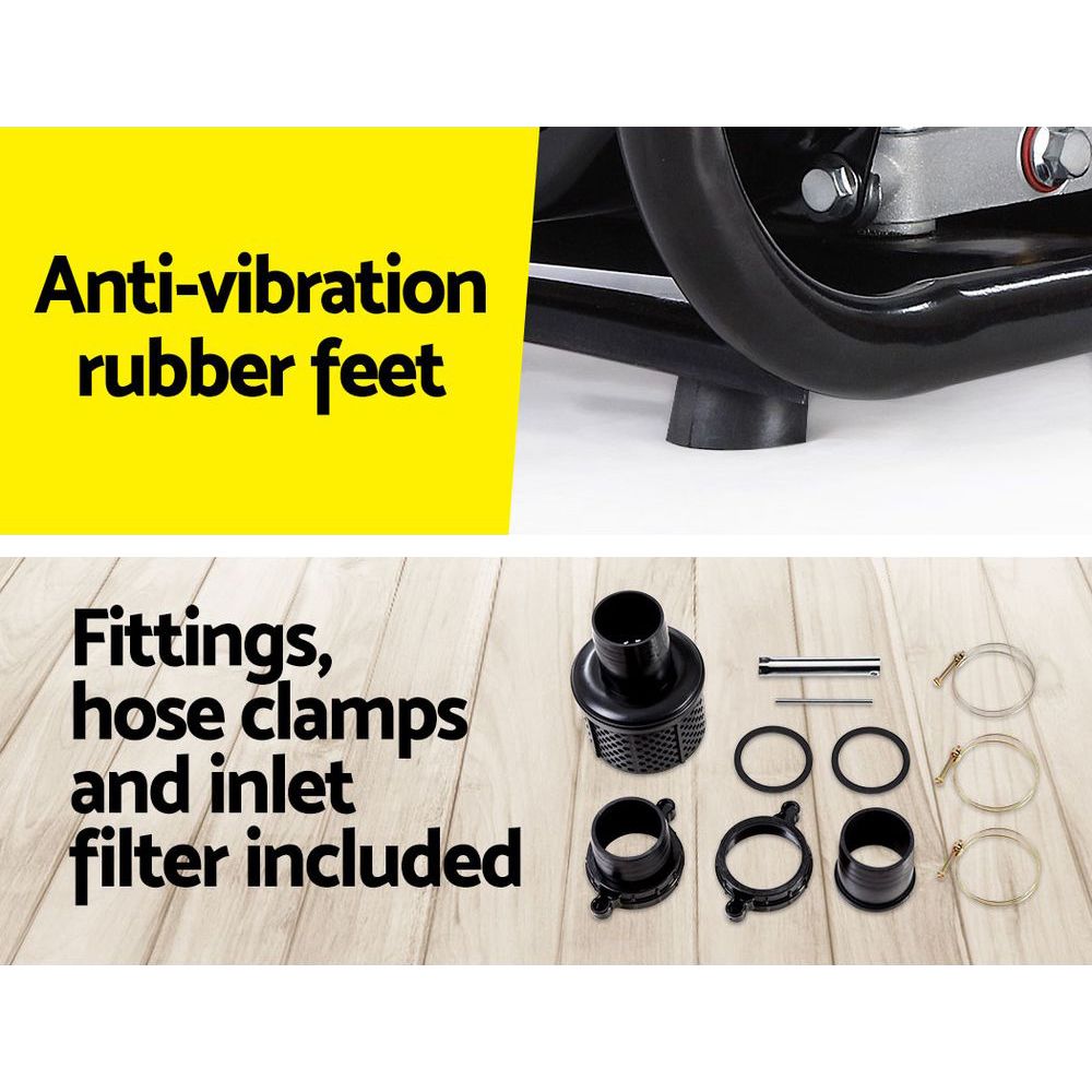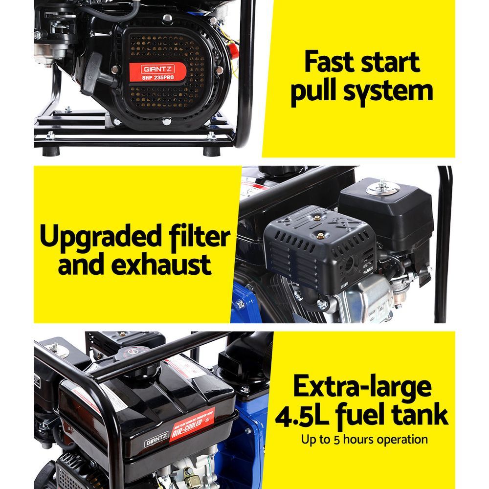 The GIANTZ Petrol Water Pump provides outstanding performance for general water pumping applications. Whether it is for heavy-duty cleaning, irrigating the garden or pumping out a flooded cellar, you will be amazed with the versatility and performance our monster water pump. Featuring a 80mm (3'') inlet/outlet and a class-leading flow rate of Max 60,000L/h (1000L/min) , the hardworking water pump is coupled with a powerful 235cc, 3600rpm 4-stroke engine that easily transfers water up to four storeys high with minimum fuss. The motor assembly is housed in an anti-corrosive tubular steel frame. Better still, ceramic and carbon seals offer great durability and longlasting use. An extra-large 4.5L fuel tank means it can run for up to five hours on a single fill (load dependent). Not least, the water pump now complies with Euro 5 emission standards unlike others that are still on Euro 2. Simply better for you and the environment.