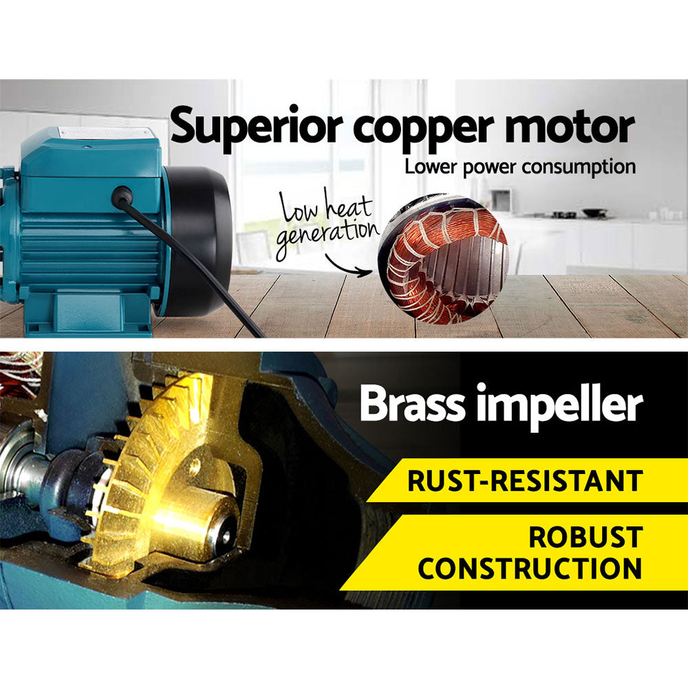 When low water pressure gets you down, power it up with our Peripheral Water Pump. Pumping out at a rate of 35L/min with a delivery head of 35m and suction up to 8m, it is the perfect solution where constant on-demand water pressure is needed at the open and close of any tap. Use it to pump your pool, increase water pressure in your pipes, water your gardens, irrigate, clean and more. The water pump features an IP-rated commercial copper motor, rust-resistant brass impeller, cast iron pump body, 1-inch inlet and outlet ports, efficient TEFC cooling system, mountable base and a power box that is both waterproof and dirt-proof. You can also accurately control the pressure to your precise requirements with the fully automatic controller and monitor it at a glance of the pressure gauge. Power to the pump is as simple as plugging it straight into any Australian standard socket. There is no need of any sophisticated knowledge of pumping, just a little imagination of how much you can do with it. It will pump up the water in no time.
