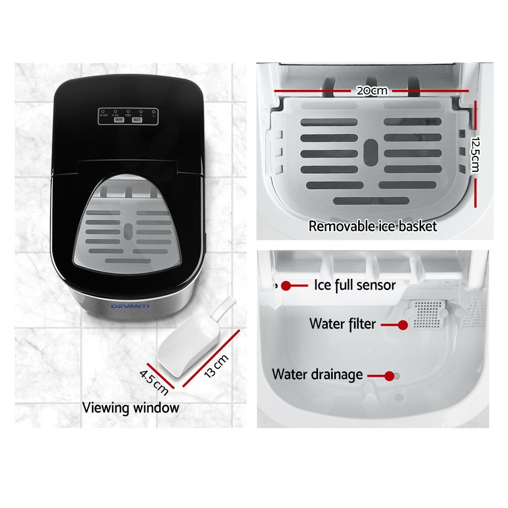 Looking for ice in a hurry? Meet our Devanti Ice Maker! Quickly produce 9 ice cubes in 6-11 minutes, with the flexibility to choose from 2 sizes. It's loaded with smart features like water shortage and ice full alarms, plus energy-saving technology through Freon-free refrigerant and enhanced heat dissipation. Its sleek, compact design fits anywhere, and with its easy-to-use controls, you’ll be enjoying cold beverages in no time. Ice at home has never been cooler!