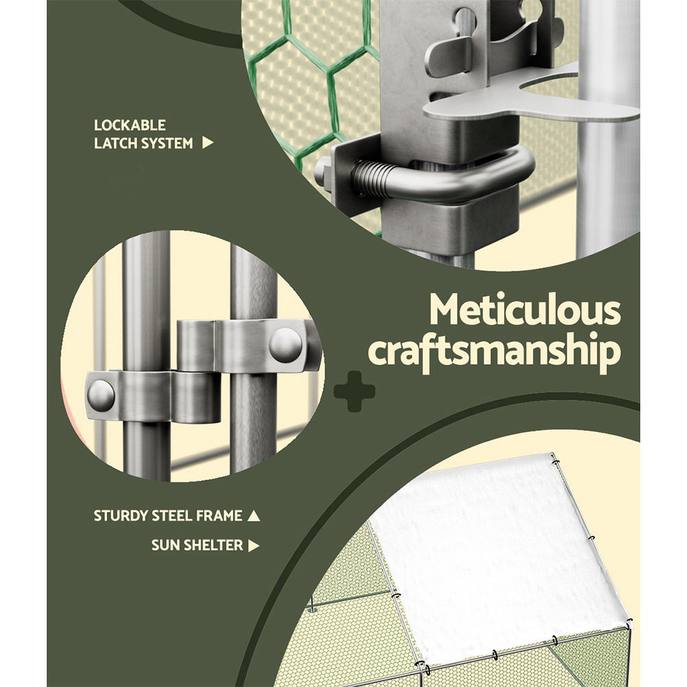 Our i.Pet Walk-in Chicken Coop designed for the comfort and safety of your chickens, geese, and ducks. This coop boasts a sturdy galvanised steel frame. Ease of access is guaranteed with a spacious entrance, seamlessly leading to a secure environment provided by the robust mesh panel and latches. Above, the roof section boasts a sun shelter, offering a serene hideout spot. Thoughtfully designed for straightforward assembly, this coop stands as the ideal home for your feathered friends.