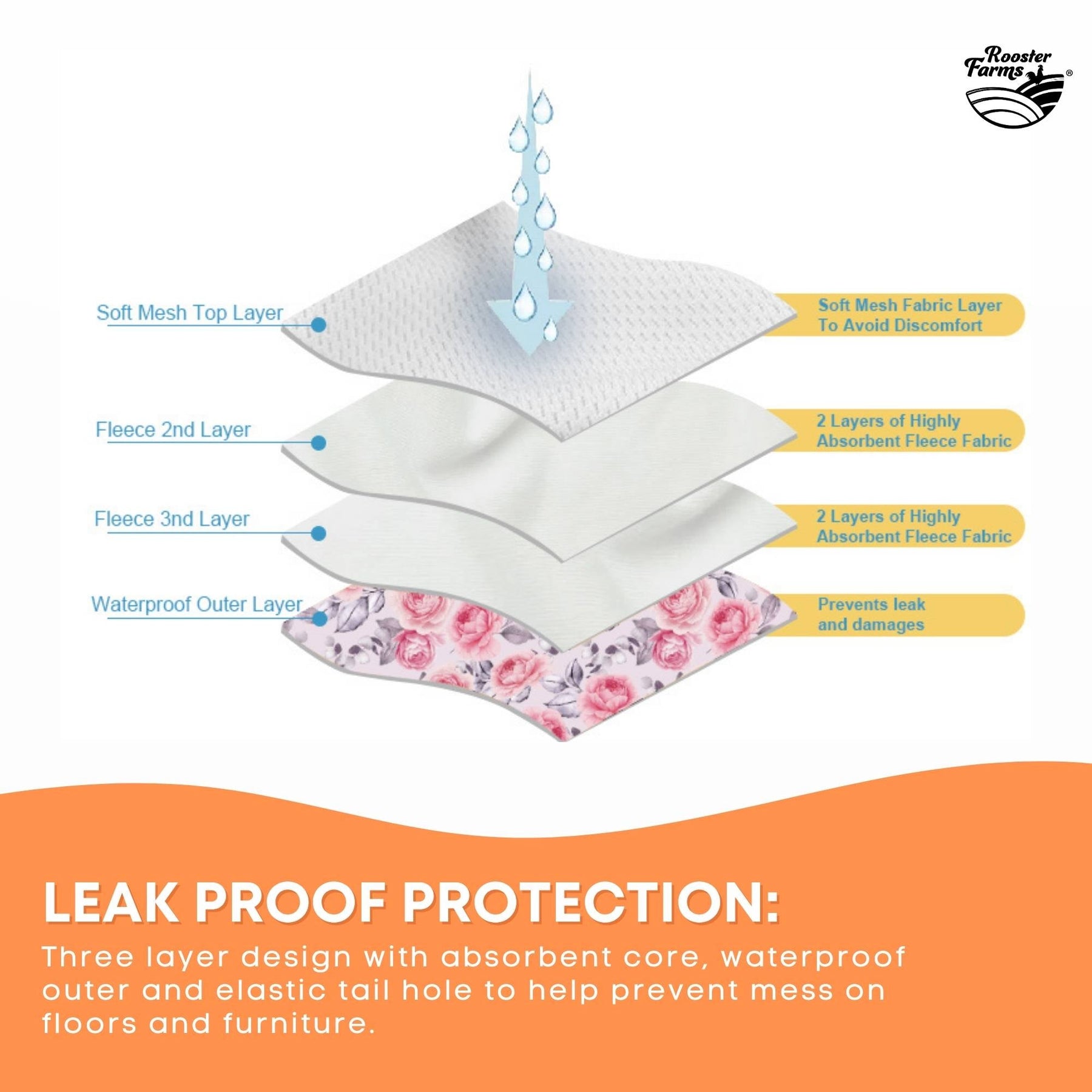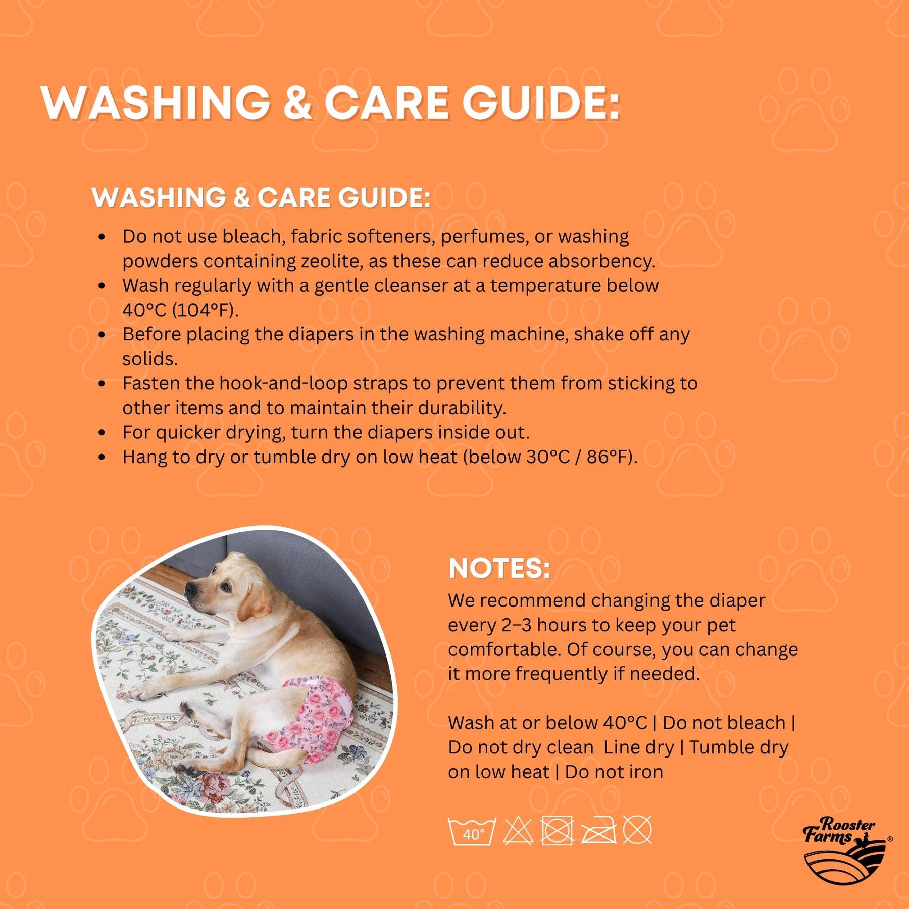 Rooster Farms Male Dog Diapers 3-Pk Washable Reusable Nappies Hook + Loop Fit will keep your dog comfortable and your home clean! Designed with a leak-proof three-layer core and secure elastic openings, these reusable nappies are perfect for incontinence, excitable urination, or recovery. Machine washable and eco-friendly for everyday use.