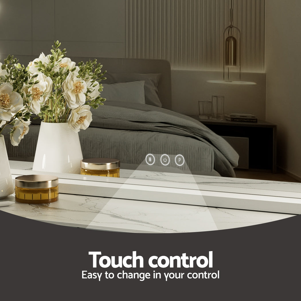 Get the star treatment with our gorgeous Embellir Lighted Makeup Mirror. Framed with 18 LED bulbs, this mirror really lights up your visage for your daily makeup regimen. The metal frame is sturdy, lightweight, and adds a glistening touch of glamour to the entire mirror. The frame sits on an equally smooth powder coated MDF base for stability and durability. Even more wonderful is that the LED light can be easily adjusted for brightness and colour temperature using touch controls: choose from cool white, daylight and warm yellow. Turn your bedroom or bathroom into a celebrity VIP set overnight with our make-up mirror, and enjoy beauty in all its illuminated brilliance.