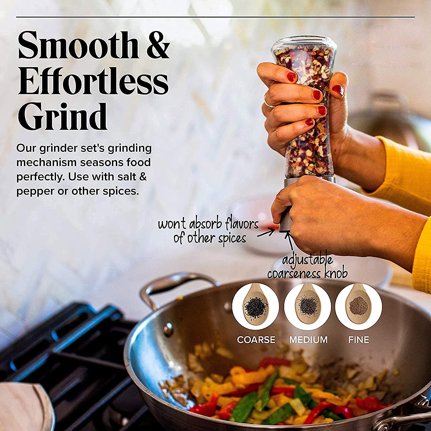 Elegant Design: With its brushed stainless steel encasing, glass body and ceramic grinder, this unique duo is a professional, sleek addition to any kitchen, with a stainless steel lid that truly "caps" off this beautiful set. No tacky electrical grinders here means no batteries required--only a few effortless twists with your hand to experience that fresh himalayan salt, pepper, or other spice.