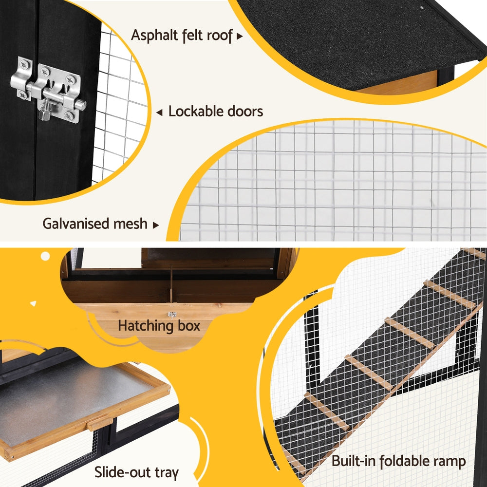The i.Pet Chicken Coop, featuring a convenient hatching box for effortless egg retrieval, provides a secure and cosy habitat for your chickens. Designed for durability, it offers ample protection and space for roaming and nesting, making it perfect for backyard chicken keepers.
