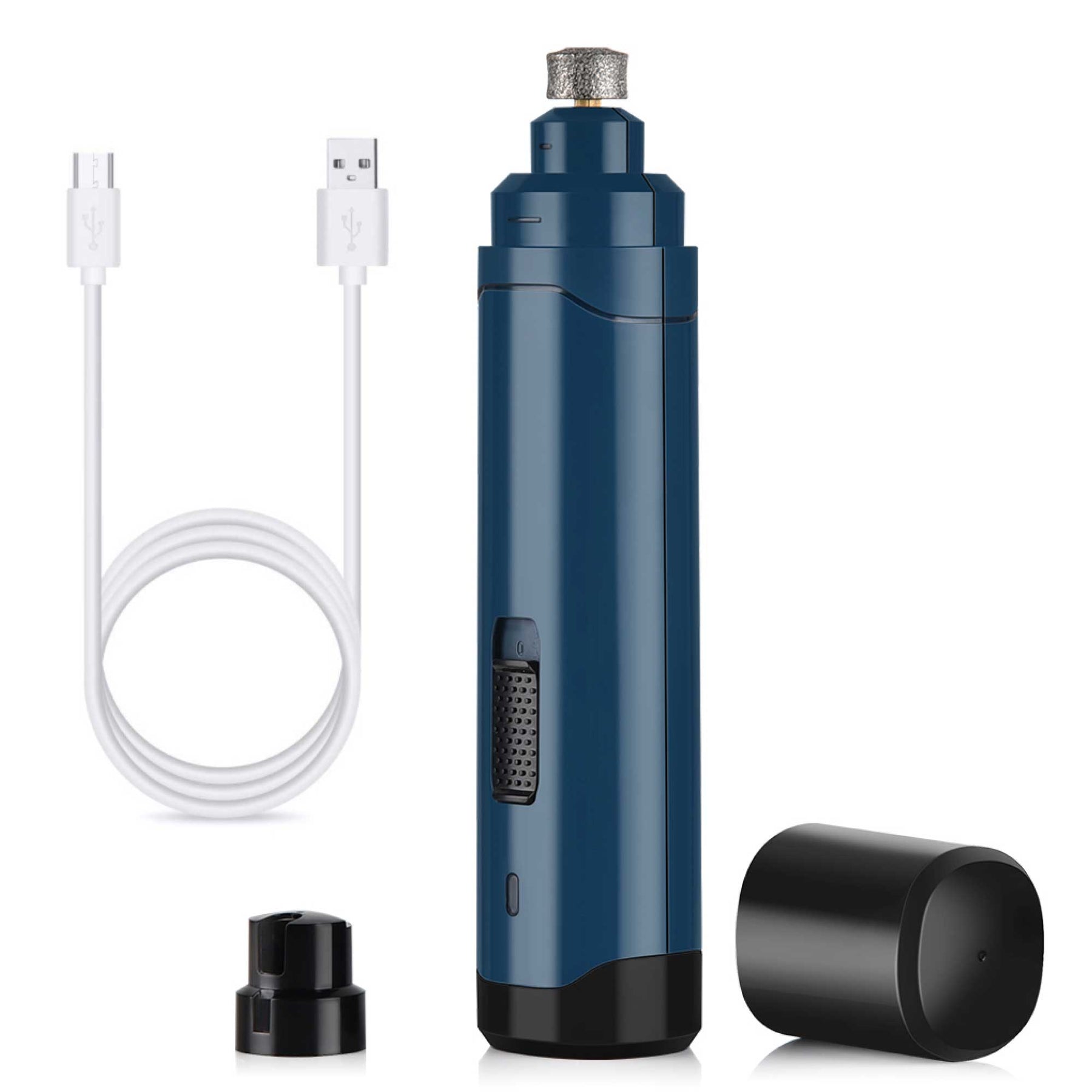 The cordless dog grinder is rechargeable and has an indicator blue light on the bottom that turns on when charging. Each grinder has a built-in battery that lasts 2 hours after a 3-hour charge. The lightweight and ergonomic body design also makes it easier to handle in your right or left hand.