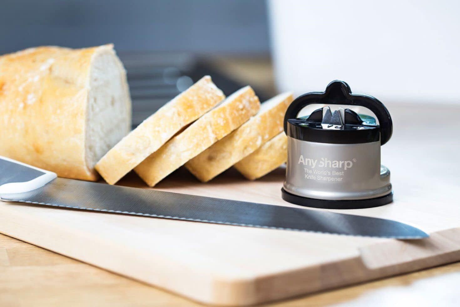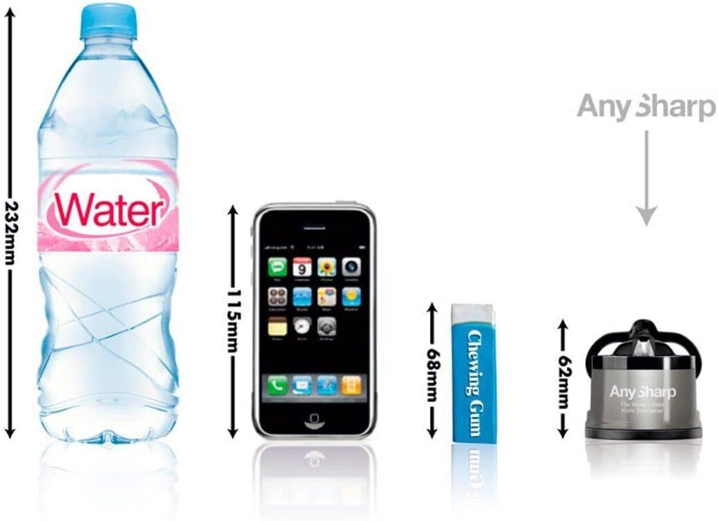AnySharp Pro Original Knife Sharpener is a compact, highly effective kitchen tool designed to restore dull knives to their optimal cutting performance, featuring a durable metal alloy body and a diamond-honed tungsten carbide sharpening tool pre-set to a 20-degree angle for precision sharpening of kitchen knives, serrated blades and even garden tools, while its innovative design includes a powerful suction grip cup that provides stable, hands-free operation for safety and ease of use, allowing anyone to achieve professional-level sharpening results without prior training with its lightweight and compact dimensions of 6x6x5 cm making it easy to store in drawers or cupboards and its patented technology delivering impressive results in just a few strokes, all packaged in a stylish black and silver finish that enhances any kitchen decor, proudly crafted with quality in Taiwan.
