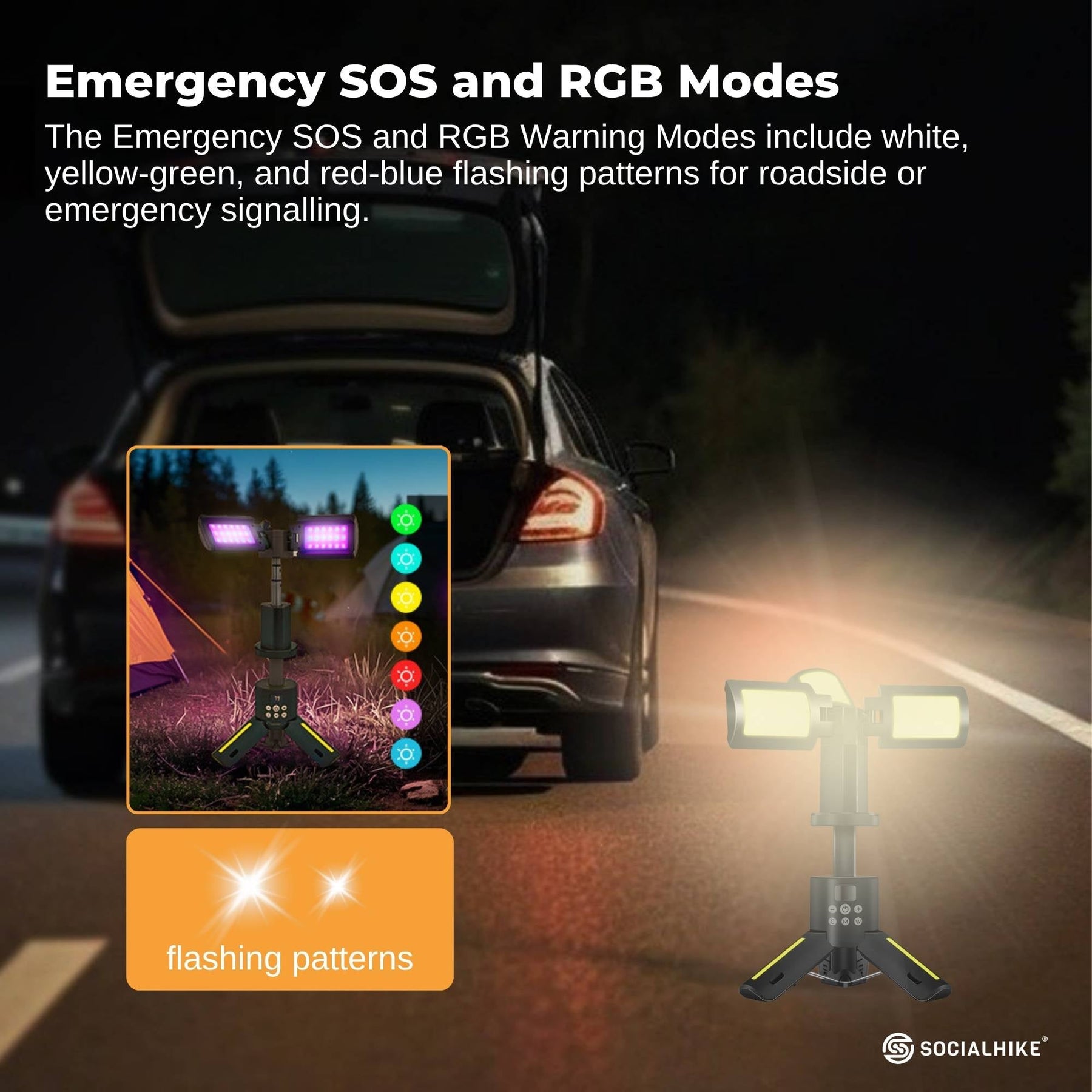 Social Hike Rechargeable Outdoor Camping Light is a foldable, telescopic lantern and power bank in one. Dual light modes, adjustable brightness, and RGB plus SOS warning lights make it ideal for camping and emergency use. Powered by a 10,050 mAh lithium-ion battery pack, it delivers up to 80 hours of light or 20W USB-C fast charging for small devices. Made from durable PC, ABS, and aluminium alloy with IPX6 water resistance and a magnetic tripod-ready base, this portable light is compact and reliable.