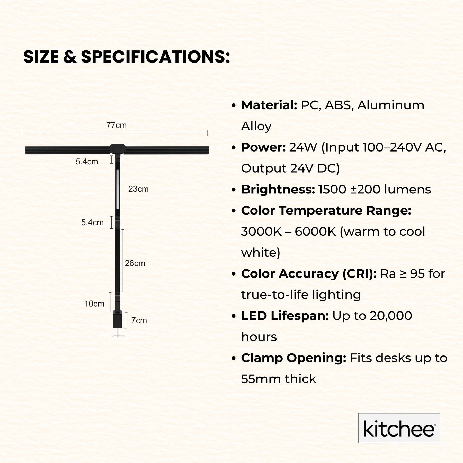 The Kitchee Tri-Fold LED Desk Lamp is a modern, flexible workstation light. Its tri-fold swing arm design lets you adjust height, angle, and direction easily, while the stepless dimming LEDs provide soft, gentle on the eyes flicker-free lighting. Attach it securely with the sturdy clamp, control brightness and colour temperature with the touch panel or remote, and fold it away neatly when not in use.