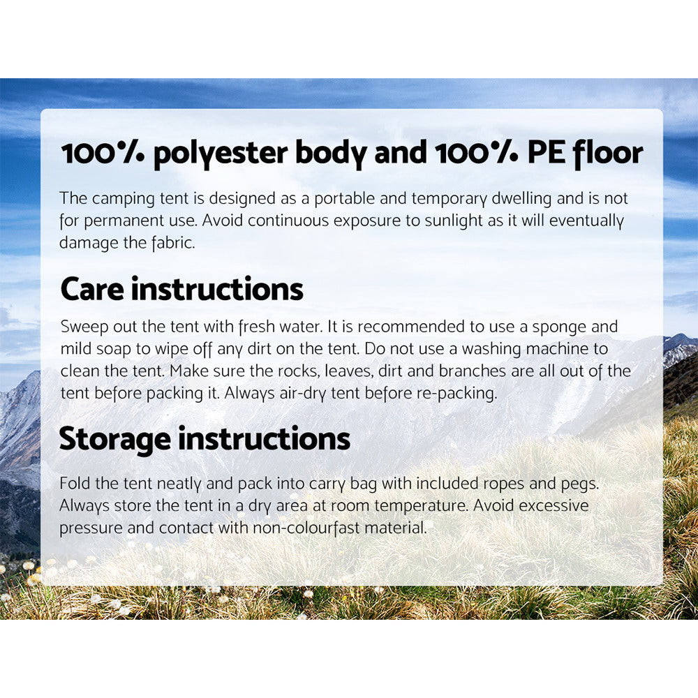 Now you can spend less time setting up the tent and more time relaxing or exploring the outdoors when you go camping with our Weisshorn 5-person Pop-Up Tent. Both the setting up and packing away of the tent is easy and can be done by a single person. In fact, it takes less than a minute to set up the tent - just throw it into an open area and watch it pop up instantly. The tent is made of high-quality heavy-duty 190T polyester material with PU coating to keep rain and UV rays at bay efficiently and effectively. The steel poles are durable and super strong to keep your tent sturdy and firm. To enable ample light and ventilation within the tent, mesh windows are featured while the oversized entrance is easily opened and closed with a handy zipper. Step inside and five persons will appreciate the generous space that welcomes them. So take that road trip to the hills or have that wonderful outdoor family picnic with total peace of mind as you load up the pop-up tent with its handy carry bag into your vehicle. Happy trails!